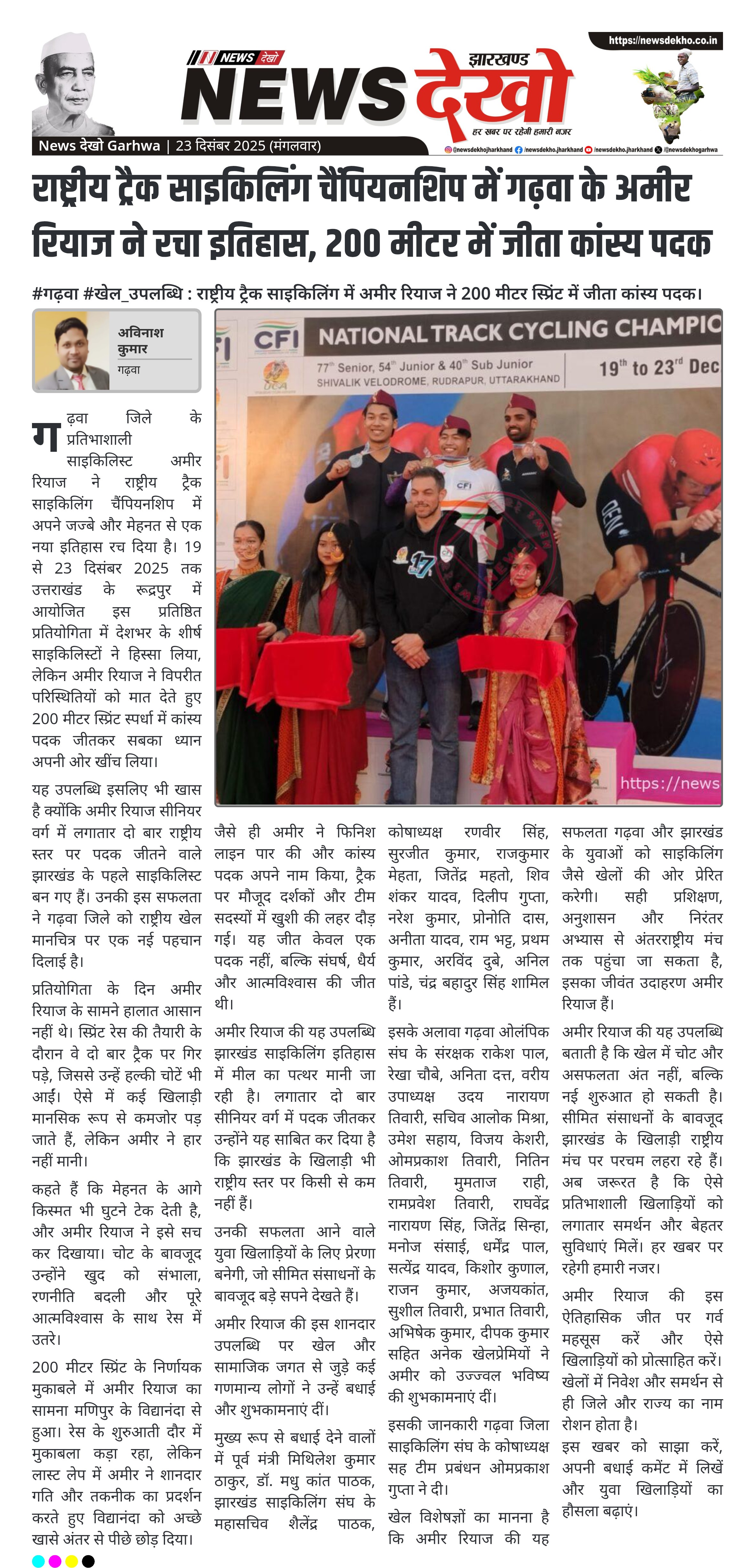 #गढ़वा #खेल_उपलब्धि : राष्ट्रीय ट्रैक साइकिलिंग में अमीर रियाज ने 200 मीटर स्प्रिंट में जीता कांस्य पदक। प्रतियोगिता: राष्ट्रीय ट्रैक साइकिलिंग चैंपियनशिप 2025। आयोजन स्थल: रूद्रपुर, उत्तराखंड। स्पर्धा: 200 मीटर स्प्रिंट (सीनियर वर्ग)। पदक: कांस्य (ब्रॉन्ज)। विशेष उपलब्धि: सीनियर वर्ग में लगातार दो बार पदक जीतने वाले झारखंड के पहले…