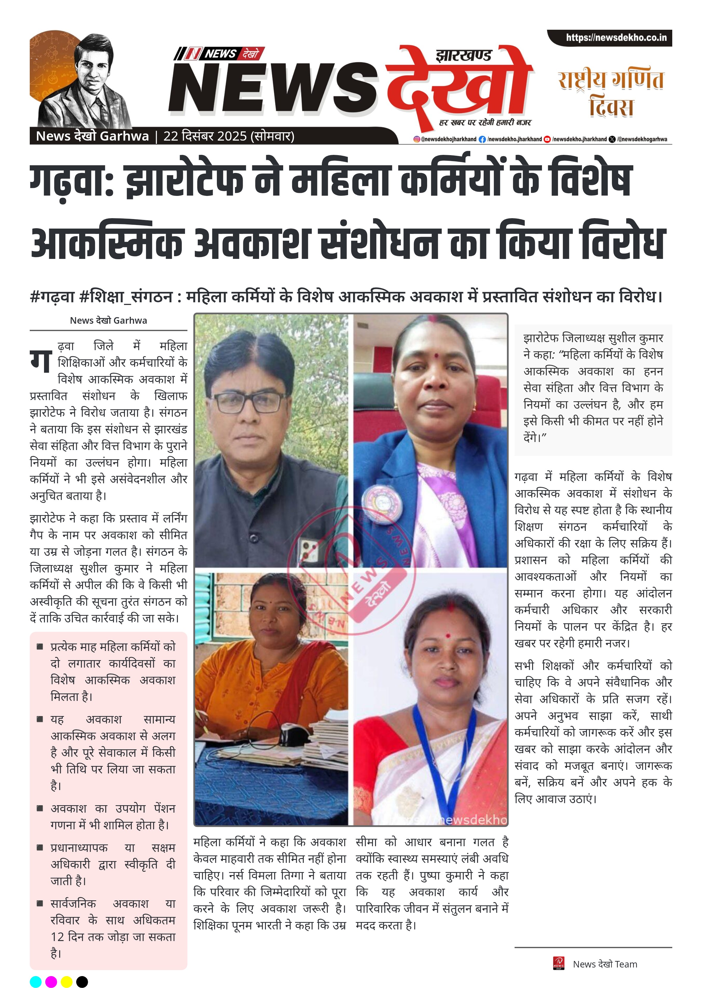 #गढ़वा #शिक्षा_संगठन : महिला कर्मियों के विशेष आकस्मिक अवकाश में प्रस्तावित संशोधन का विरोध। स्थान: गढ़वा, झारखंड। संगठन: झारखंड शिक्षक एवं कर्मचारी संघ (झारोटेफ)। विरोध का कारण: महिला कर्मियों के विशेष आकस्मिक अवकाश में प्रस्तावित सीमितता। नियम: प्रत्येक माह दो लगातार कार्यदिवस का विशेष आकस्मिक अवकाश, पेंशन गणना में शामिल।…