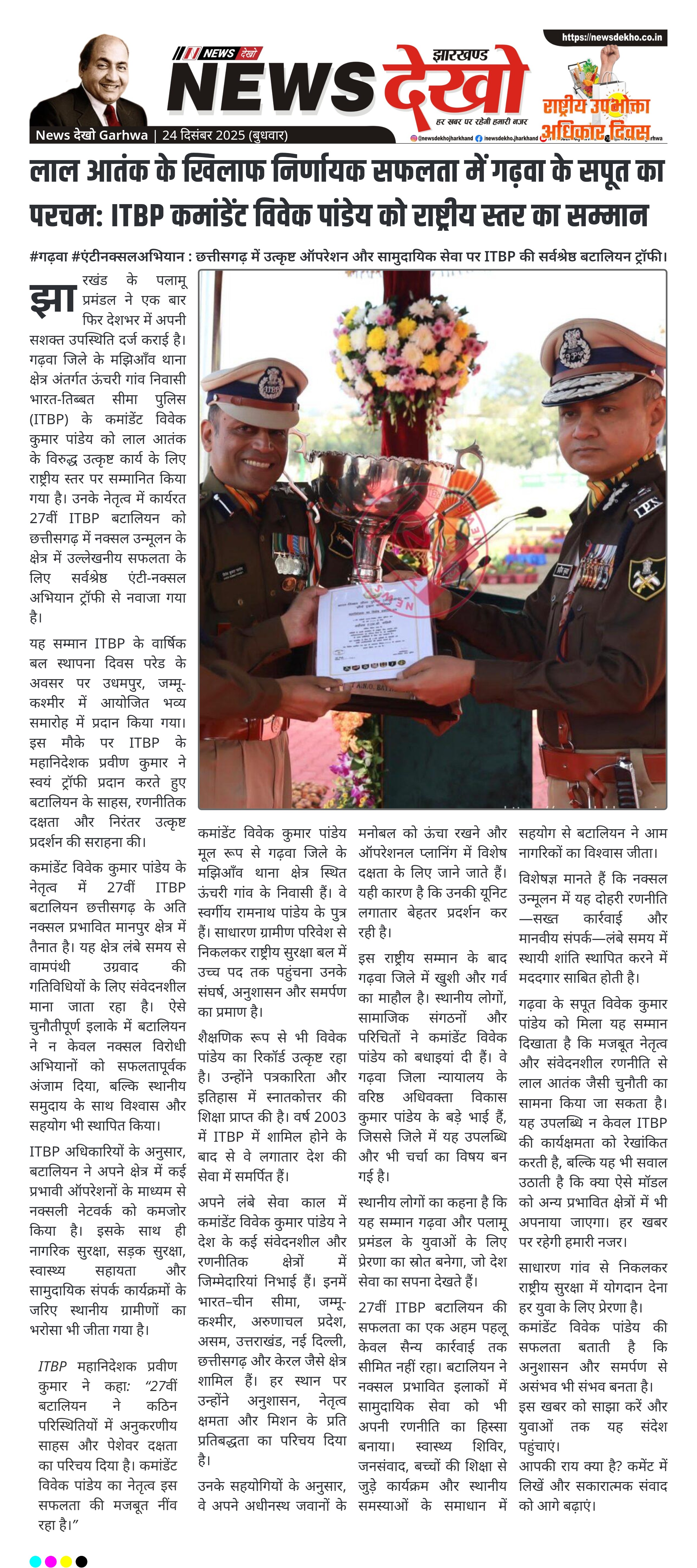 लाल आतंक के खिलाफ निर्णायक सफलता में गढ़वा के सपूत का परचम: ITBP कमांडेंट विवेक पांडेय को राष्ट्रीय स्तर का सम्मान