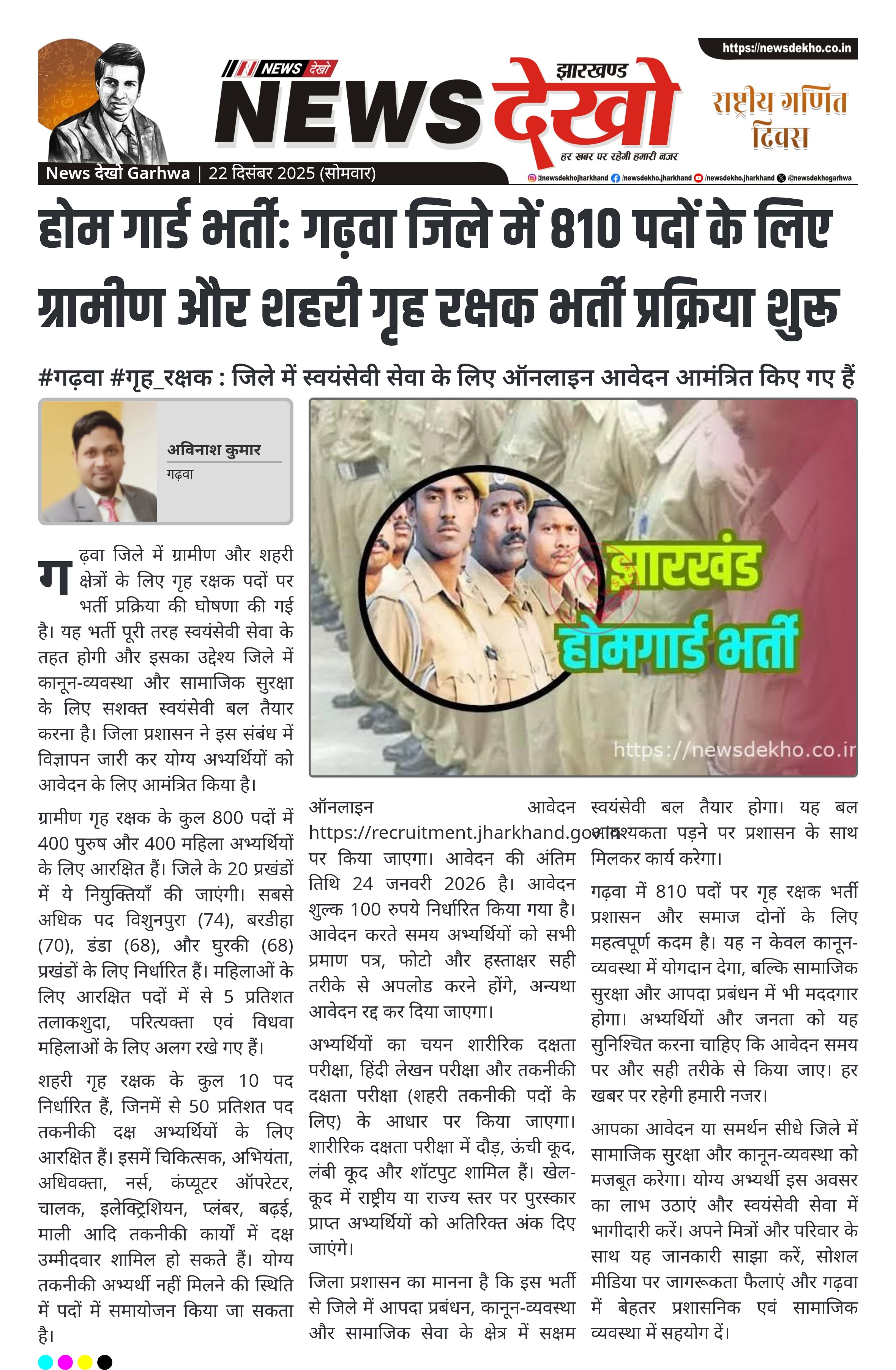 #गढ़वा #गृह_रक्षक : जिले में स्वयंसेवी सेवा के लिए ऑनलाइन आवेदन आमंत्रित किए गए हैं। कुल पद: 810 (ग्रामीण 800, शहरी 10)। ग्रामीण गृह रक्षक: 400 पुरुष, 400 महिला, 50 प्रतिशत महिला आरक्षित। शहरी गृह रक्षक: 50 प्रतिशत तकनीकी दक्ष अभ्यर्थियों के लिए आरक्षित। आवेदन तिथि: 26 दिसंबर 2025 से…