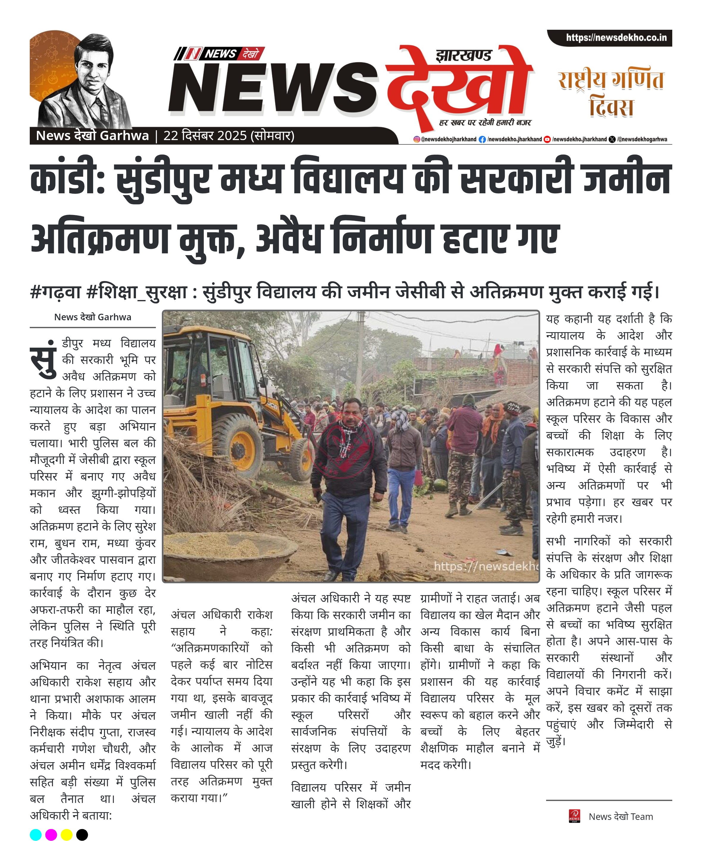 #गढ़वा #शिक्षा_सुरक्षा : सुंडीपुर विद्यालय की जमीन जेसीबी से अतिक्रमण मुक्त कराई गई। स्थान: सुंडीपुर मध्य विद्यालय, कांडी, गढ़वा। कार्रवाई की तिथि: सोमवार, हाल ही में। अतिक्रमण हटाए गए: अवैध मकान और झुग्गी-झोपड़ियां। प्रमुख अधिकारी: अंचल अधिकारी राकेश सहाय, थाना प्रभारी अशफाक आलम। सहायक अधिकारी: अंचल निरीक्षक संदीप गुप्ता, राजस्व…