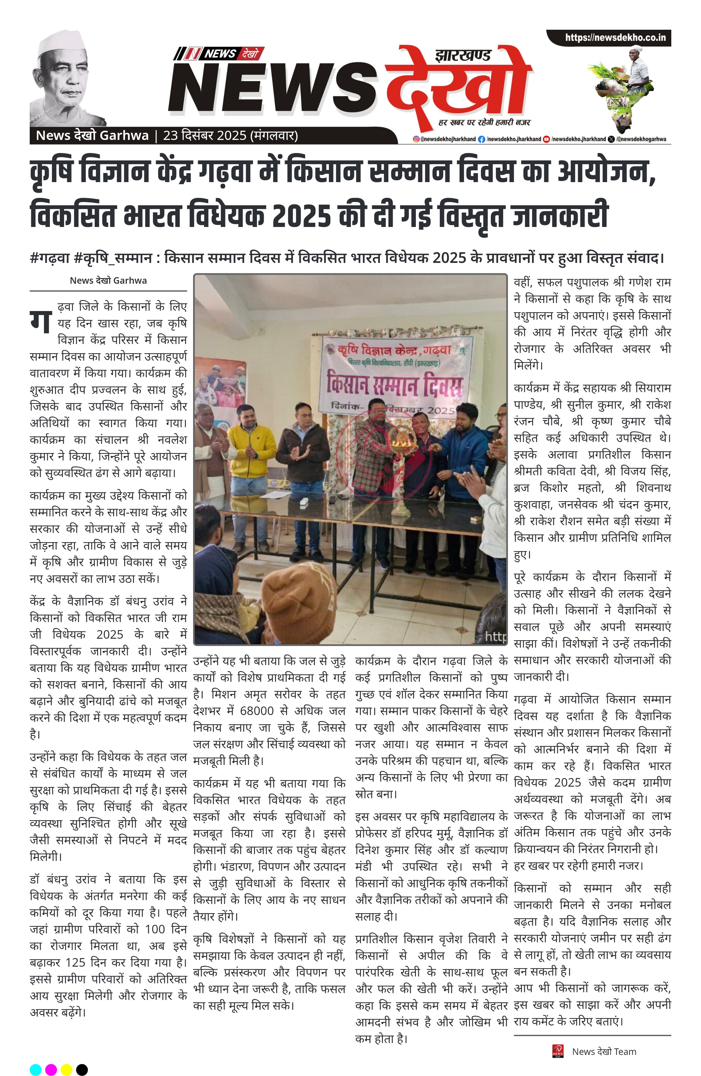 कृषि विज्ञान केंद्र गढ़वा में किसान सम्मान दिवस का आयोजन, विकसित भारत विधेयक 2025 की दी गई विस्तृत जानकारी