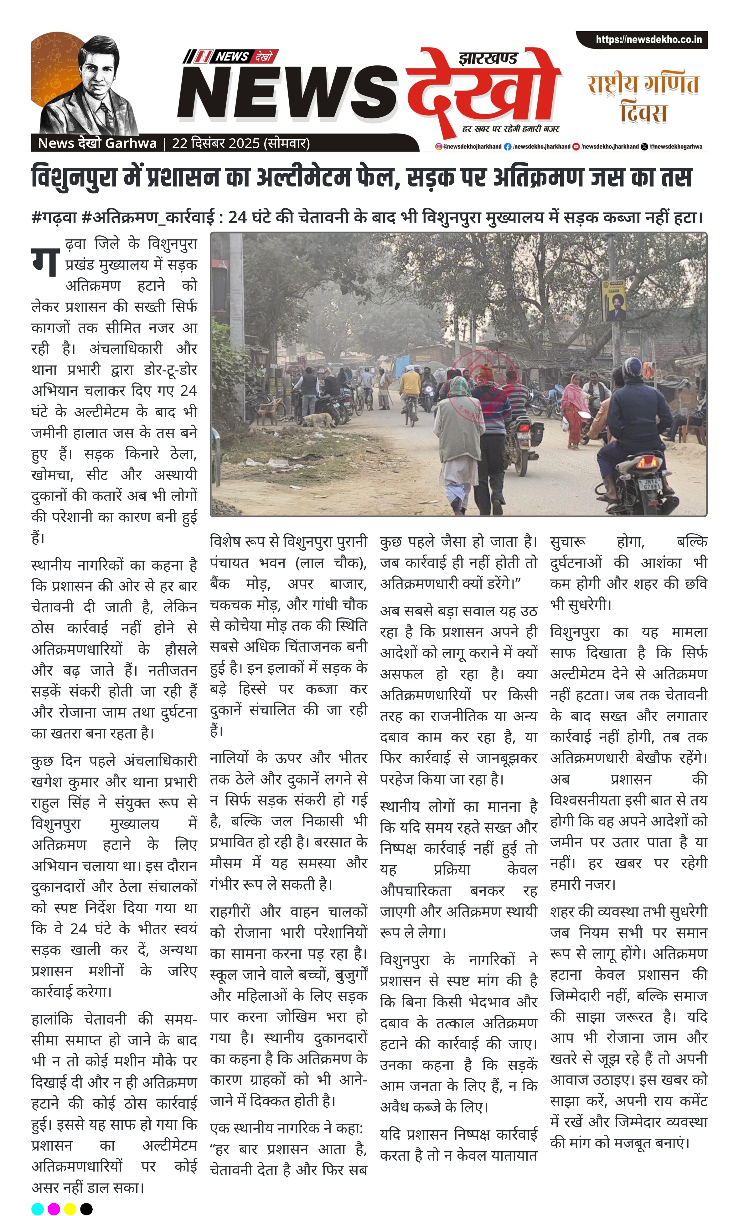 #गढ़वा #अतिक्रमण_कार्रवाई : 24 घंटे की चेतावनी के बाद भी विशुनपुरा मुख्यालय में सड़क कब्जा नहीं हटा। विशुनपुरा प्रखंड मुख्यालय में प्रशासन का अल्टीमेटम बेअसर। 24 घंटे की समय-सीमा के बाद भी सड़क पर अतिक्रमण कायम। नाली के भीतर तक दुकानें, आवागमन बुरी तरह प्रभावित। अंचलाधिकारी खगेश कुमार और थाना…