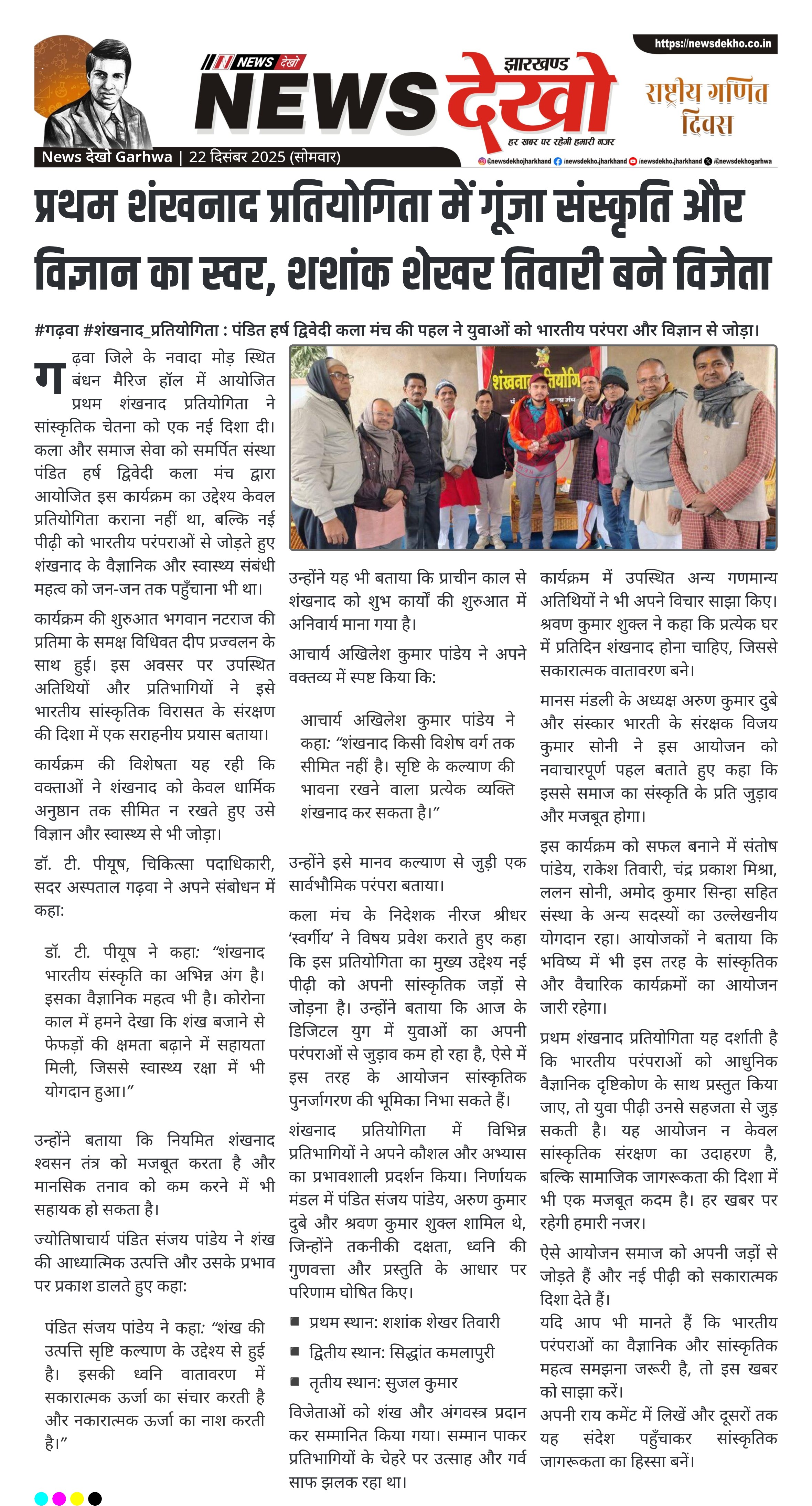 #गढ़वा #शंखनाद_प्रतियोगिता : पंडित हर्ष द्विवेदी कला मंच की पहल ने युवाओं को भारतीय परंपरा और विज्ञान से जोड़ा। आयोजन स्थल: नवादा मोड़ स्थित बंधन मैरिज हॉल, गढ़वा। आयोजक संस्था: पंडित हर्ष द्विवेदी कला मंच, नवादा (गढ़वा)। मुख्य उद्देश्य: युवाओं को भारतीय परंपराओं और शंखनाद के वैज्ञानिक महत्व से जोड़ना।…