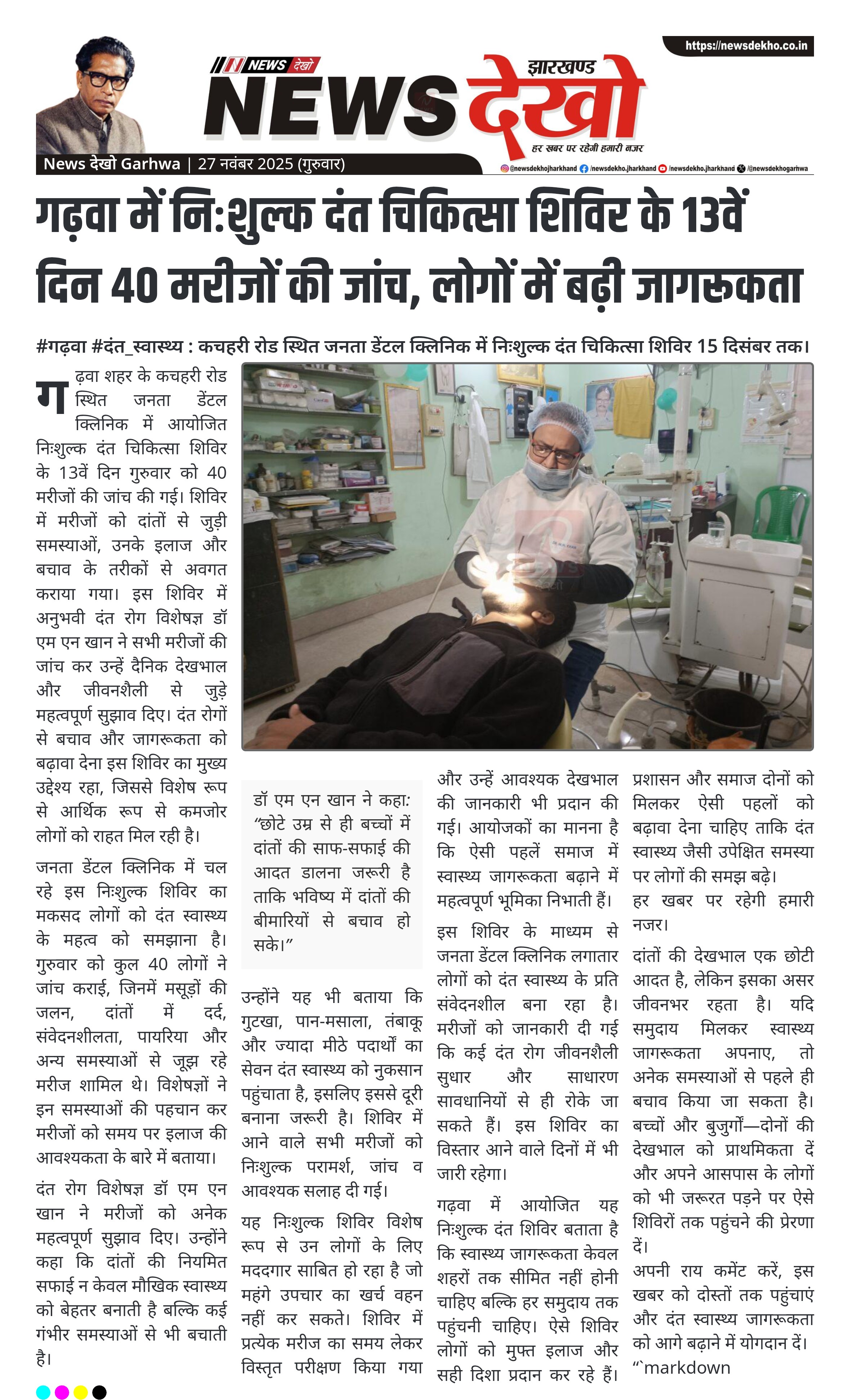 गढ़वा में निःशुल्क दंत चिकित्सा शिविर के 13वें दिन 40 मरीजों की जांच, लोगों में बढ़ी जागरूकता