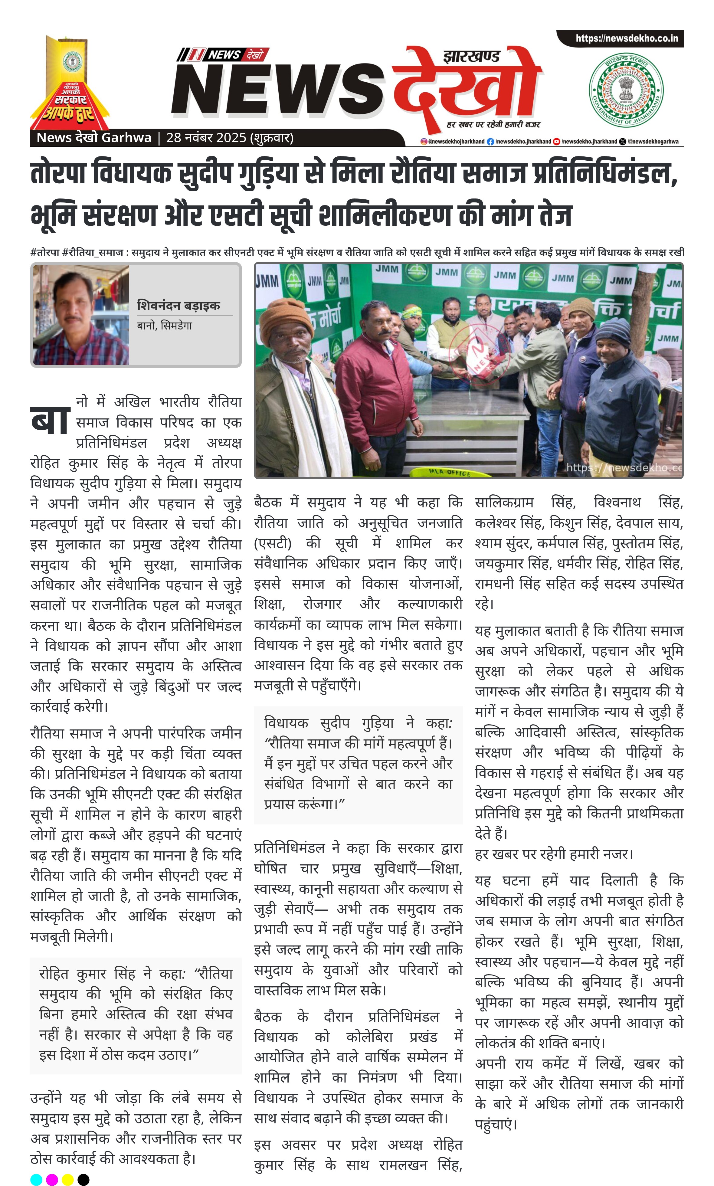 तोरपा विधायक सुदीप गुड़िया से मिला रौतिया समाज प्रतिनिधिमंडल, भूमि संरक्षण और एसटी सूची शामिलीकरण की मांग तेज