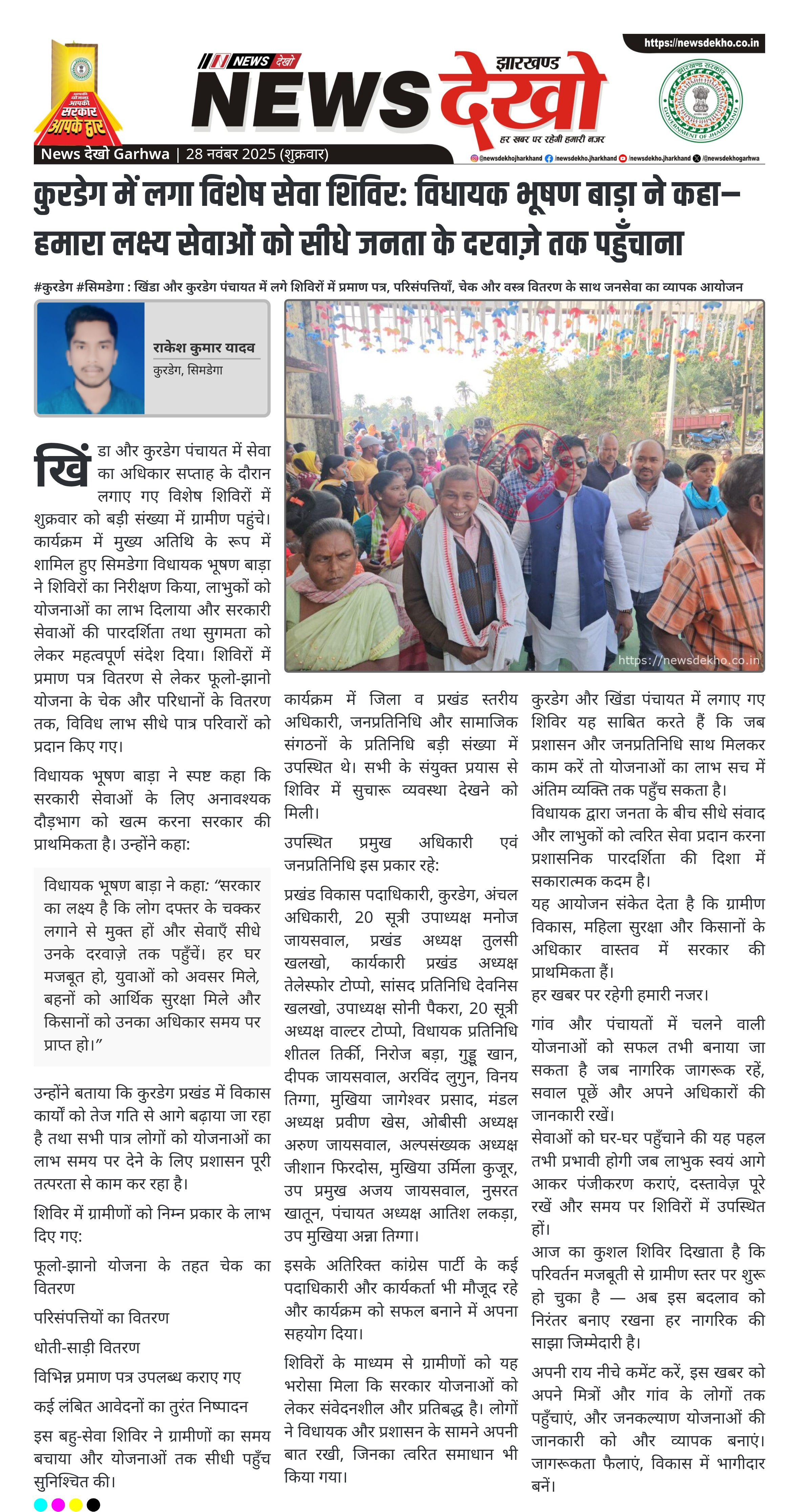 #कुरडेग #सिमडेगा : खिंडा और कुरडेग पंचायत में लगे शिविरों में प्रमाण पत्र, परिसंपत्तियाँ, चेक और वस्त्र वितरण के साथ जनसेवा का व्यापक आयोजन विधायक भूषण बाड़ा ने खिंडा और कुरडेग पंचायत में सेवा का अधिकार सप्ताह के तहत आयोजित शिविरों में भाग लिया। लाभुकों को प्रमाण पत्र, परिसंपत्तियाँ, फूलो-झानो…
