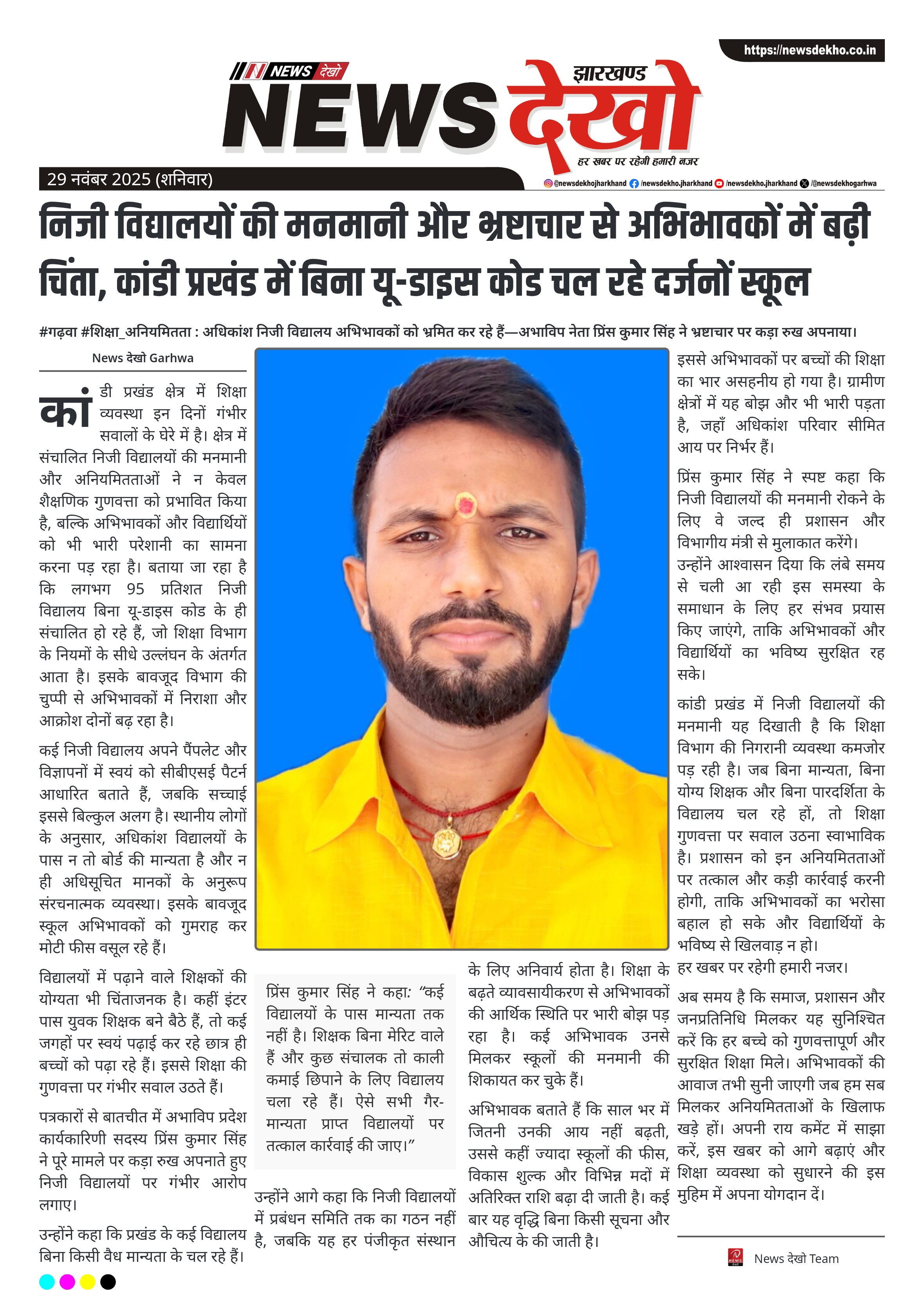 #गढ़वा #शिक्षा_अनियमितता : अधिकांश निजी विद्यालय अभिभावकों को भ्रमित कर रहे हैं—अभाविप नेता प्रिंस कुमार सिंह ने भ्रष्टाचार पर कड़ा रुख अपनाया। कांडी प्रखंड में लगभग 95 फीसदी निजी विद्यालयों के पास यू-डाइस कोड नहीं है। कई स्कूल अपने पैंपलेट में सीबीएसई पैटर्न का दावा कर अभिभावकों को भ्रमित कर…