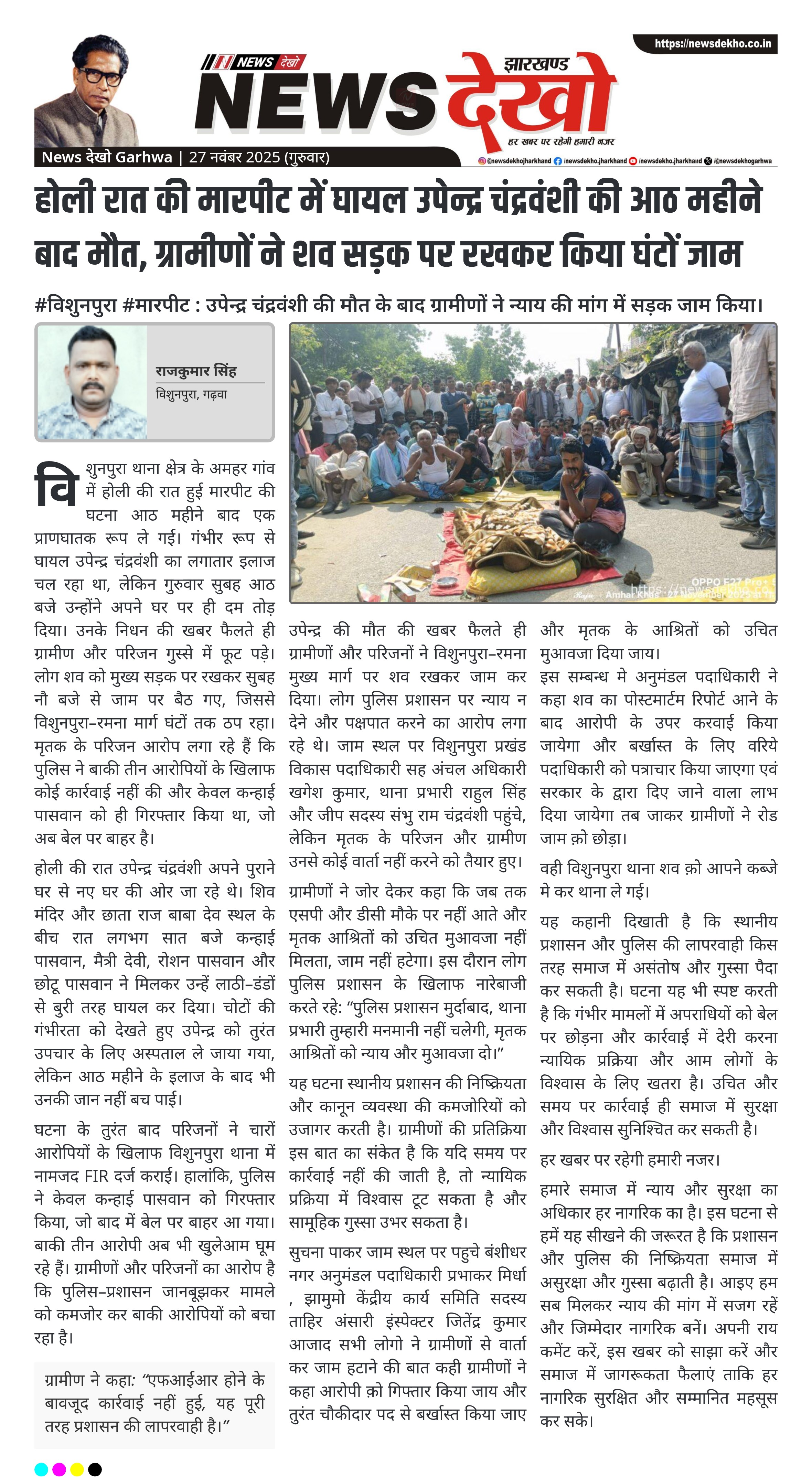 होली रात की मारपीट में घायल उपेन्द्र चंद्रवंशी की आठ महीने बाद मौत, ग्रामीणों ने शव सड़क पर रखकर किया घंटों जाम