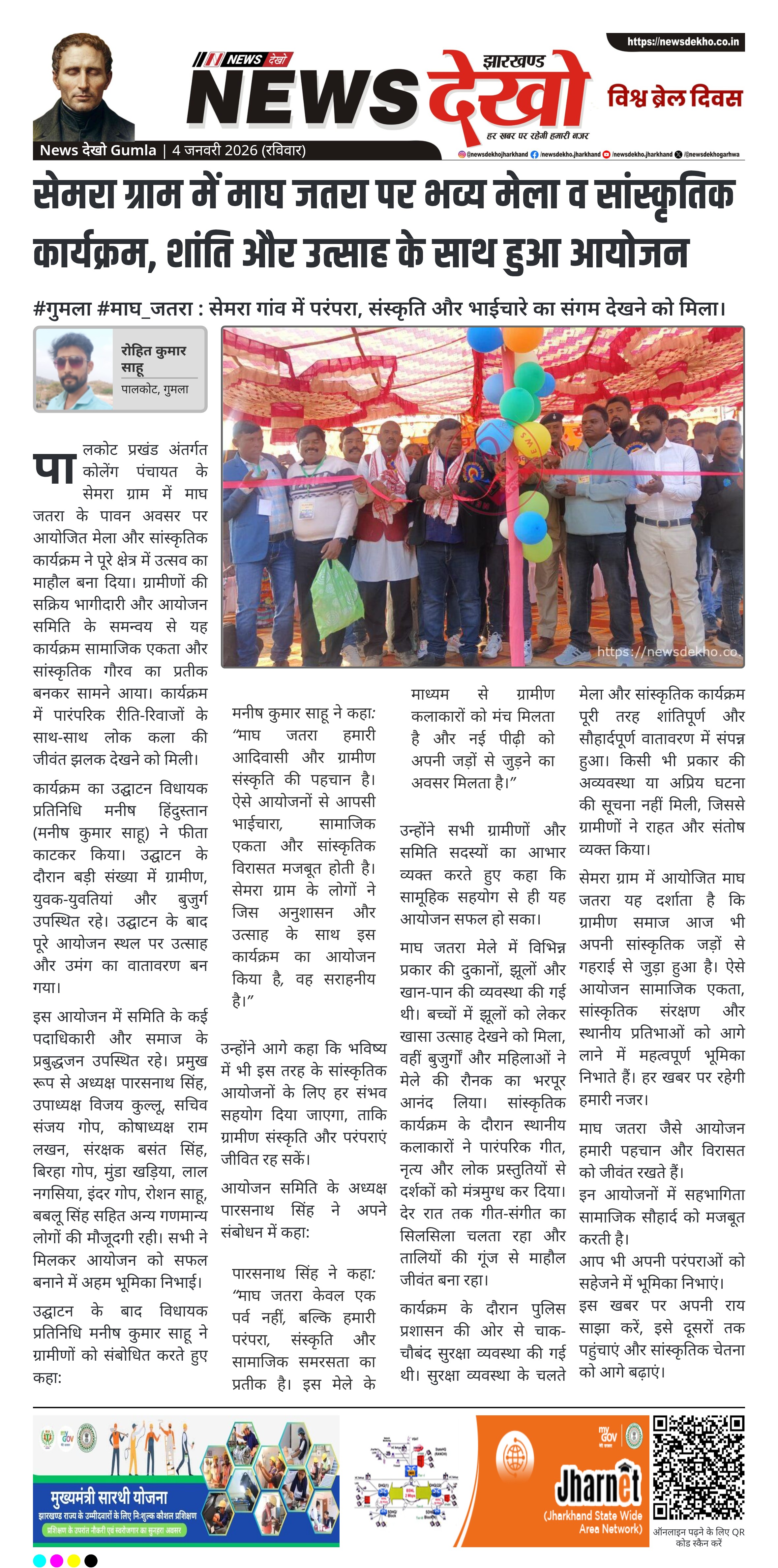 #गुमला #माघ_जतरा : सेमरा गांव में परंपरा, संस्कृति और भाईचारे का संगम देखने को मिला। सेमरा ग्राम में माघ जतरा के अवसर पर भव्य मेला एवं सांस्कृतिक कार्यक्रम। विधायक प्रतिनिधि मनीष कुमार साहू ने फीता काटकर किया उद्घाटन। आयोजन समिति के अध्यक्ष पारसनाथ सिंह सहित कई गणमान्य लोग रहे मौजूद।…