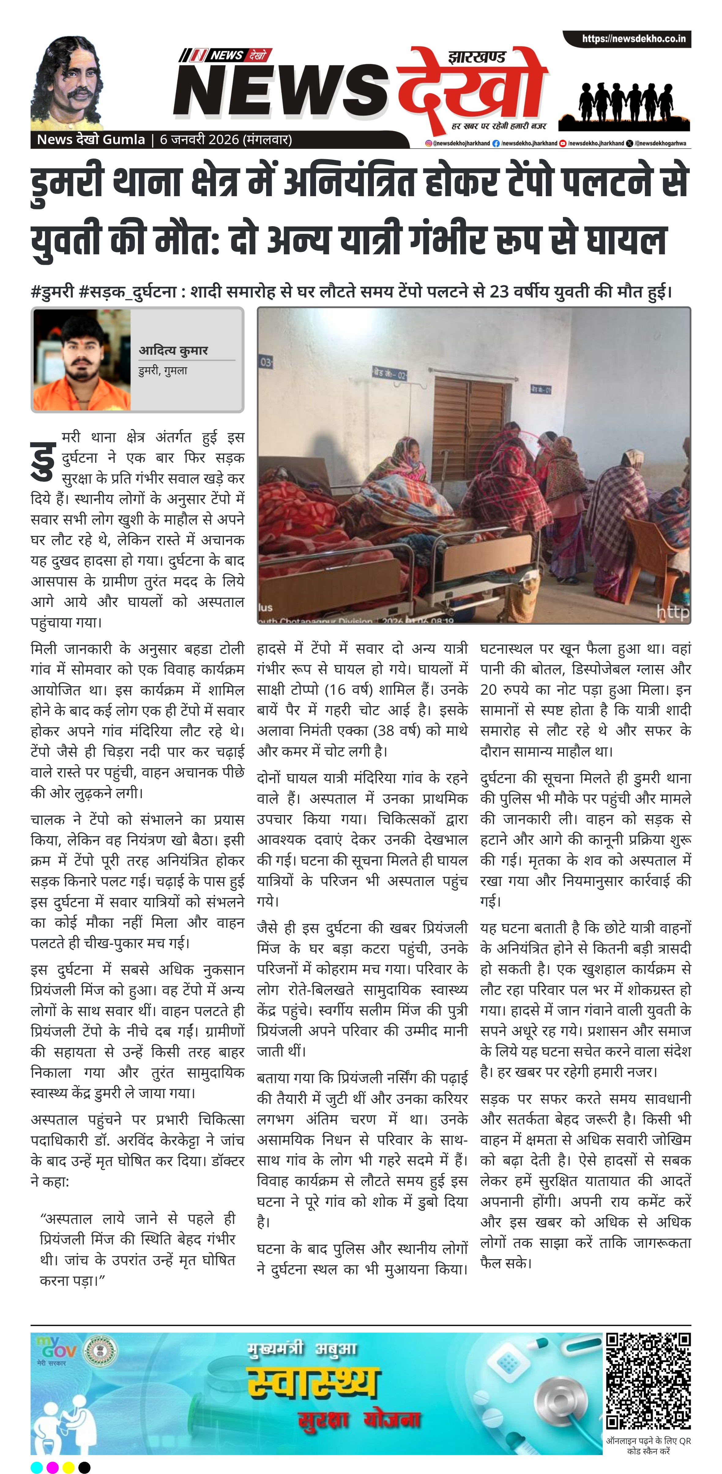 डुमरी थाना क्षेत्र में अनियंत्रित होकर टेंपो पलटने से युवती की मौत: दो अन्य यात्री गंभीर रूप से घायल