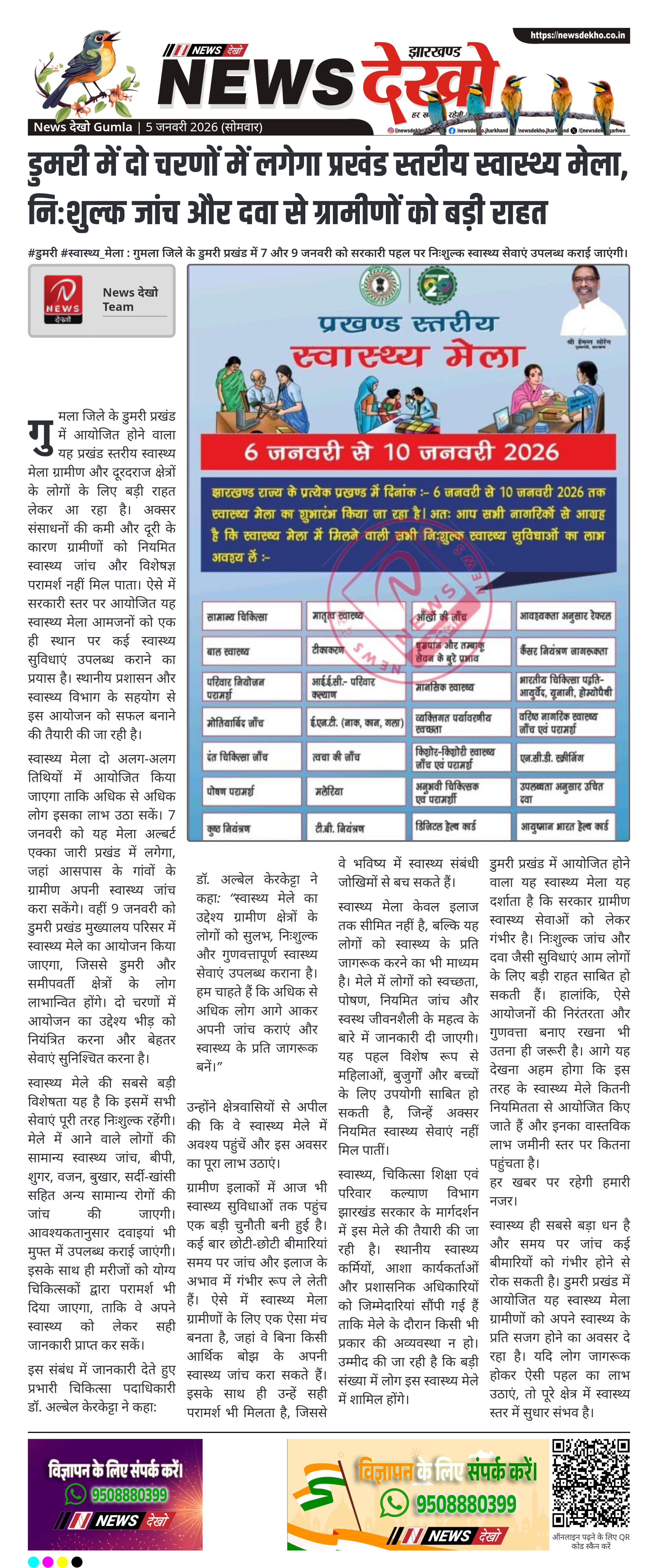 #डुमरी #स्वास्थ्य_मेला : गुमला जिले के डुमरी प्रखंड में 7 और 9 जनवरी को सरकारी पहल पर निःशुल्क स्वास्थ्य सेवाएं उपलब्ध कराई जाएंगी। 7 जनवरी को अल्बर्ट एक्का जारी प्रखंड में स्वास्थ्य मेला आयोजित। 9 जनवरी को डुमरी प्रखंड मुख्यालय परिसर में दूसरा चरण। निःशुल्क स्वास्थ्य जांच, दवा और परामर्श…