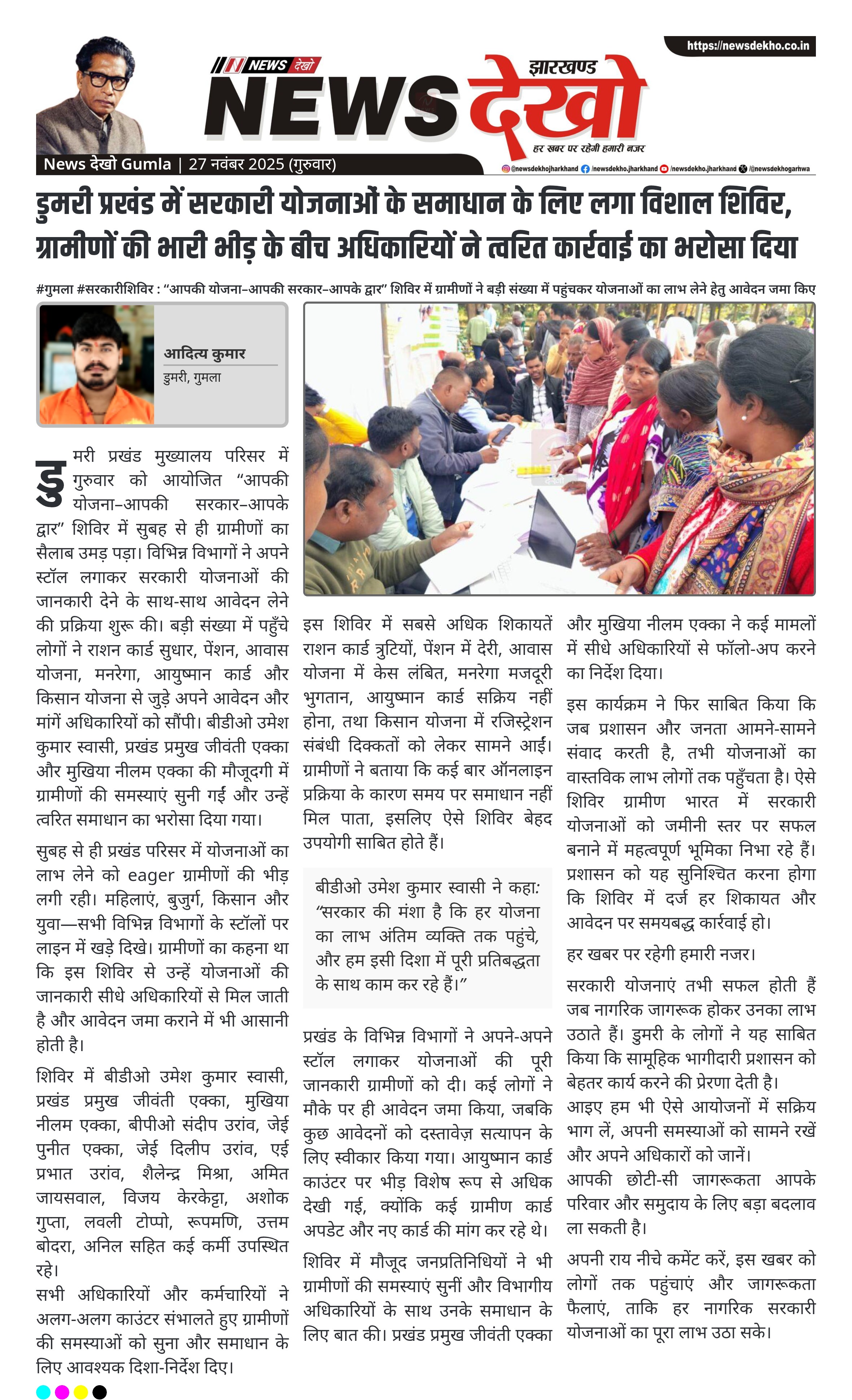 #गुमला #सरकारीशिविर : “आपकी योजना–आपकी सरकार–आपके द्वार” शिविर में ग्रामीणों ने बड़ी संख्या में पहुंचकर योजनाओं का लाभ लेने हेतु आवेदन जमा किए। डुमरी प्रखंड परिसर में गुरुवार को “आपकी योजना–आपकी सरकार–आपके द्वार” शिविर का आयोजन। सुबह से ग्रामीणों की भारी भीड़, कई विभागों के स्टॉल लगाए गए। बीडीओ उमेश…