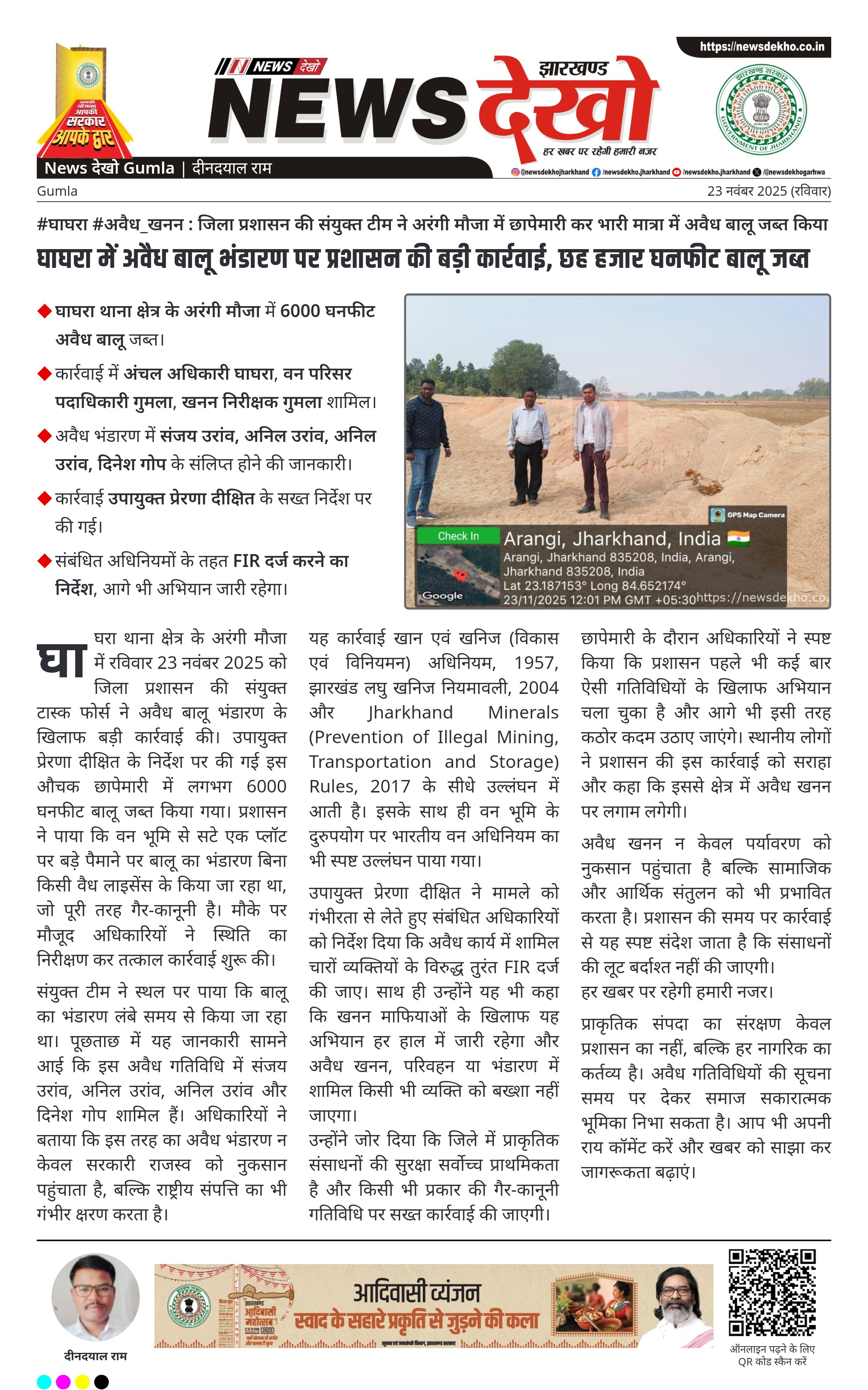 #घाघरा #अवैध_खनन : जिला प्रशासन की संयुक्त टीम ने अरंगी मौजा में छापेमारी कर भारी मात्रा में अवैध बालू जब्त किया घाघरा थाना क्षेत्र के अरंगी मौजा में 6000 घनफीट अवैध बालू जब्त। कार्रवाई में अंचल अधिकारी घाघरा, वन परिसर पदाधिकारी गुमला, खनन निरीक्षक गुमला शामिल। अवैध भंडारण में संजय…