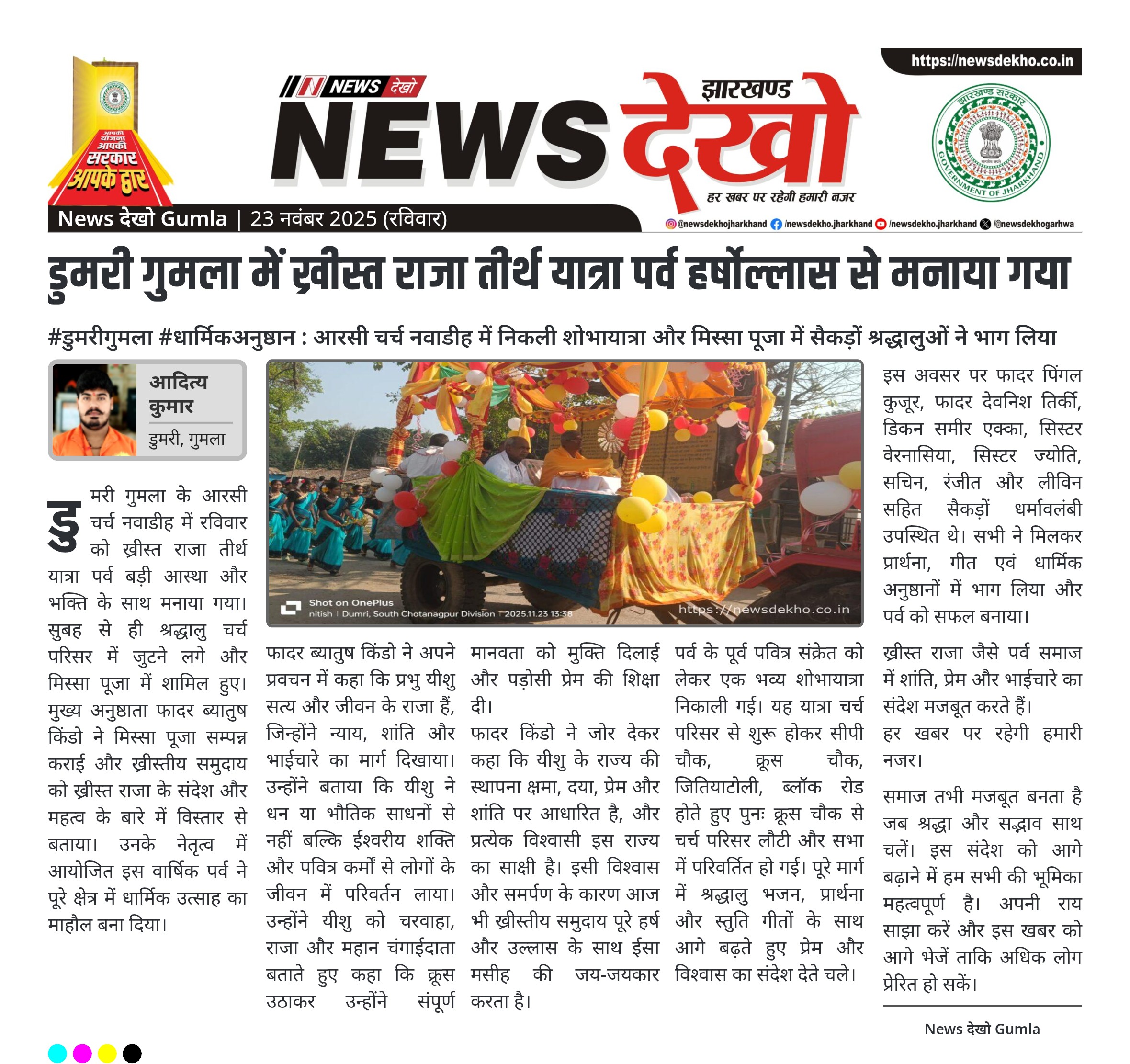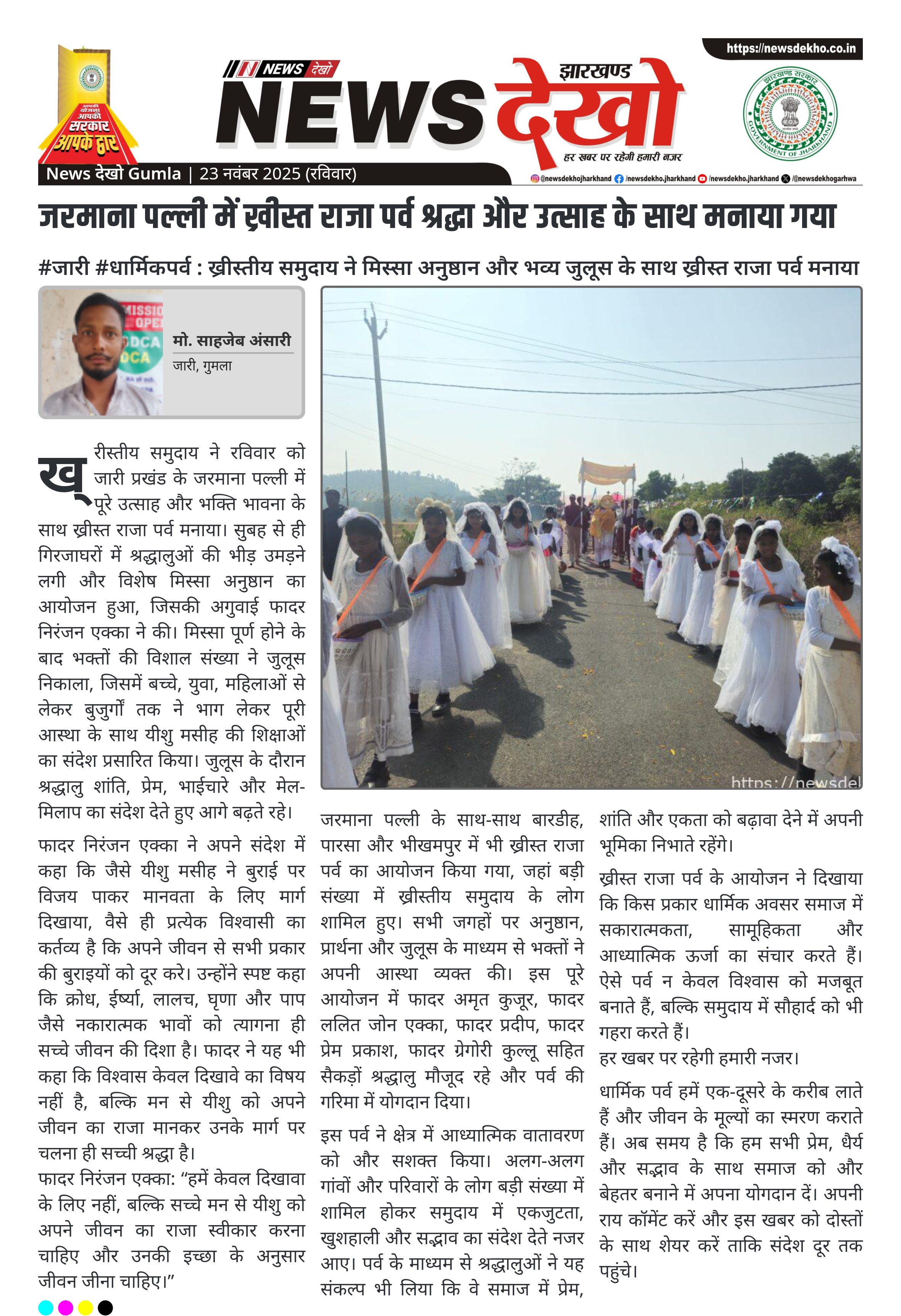 #जारी #धार्मिकपर्व : ख्रीस्तीय समुदाय ने मिस्सा अनुष्ठान और भव्य जुलूस के साथ ख्रीस्त राजा पर्व मनाया जरमाना पल्ली में ख्रीस्त राजा पर्व धूमधाम से मनाया गया। मुख्य मिस्सा अनुष्ठान की अध्यक्षता फादर निरंजन एक्का ने की। श्रद्धालुओं ने जुलूस निकालकर शांति, प्रेम और मेल-मिलाप का संदेश दिया। फादर ने…