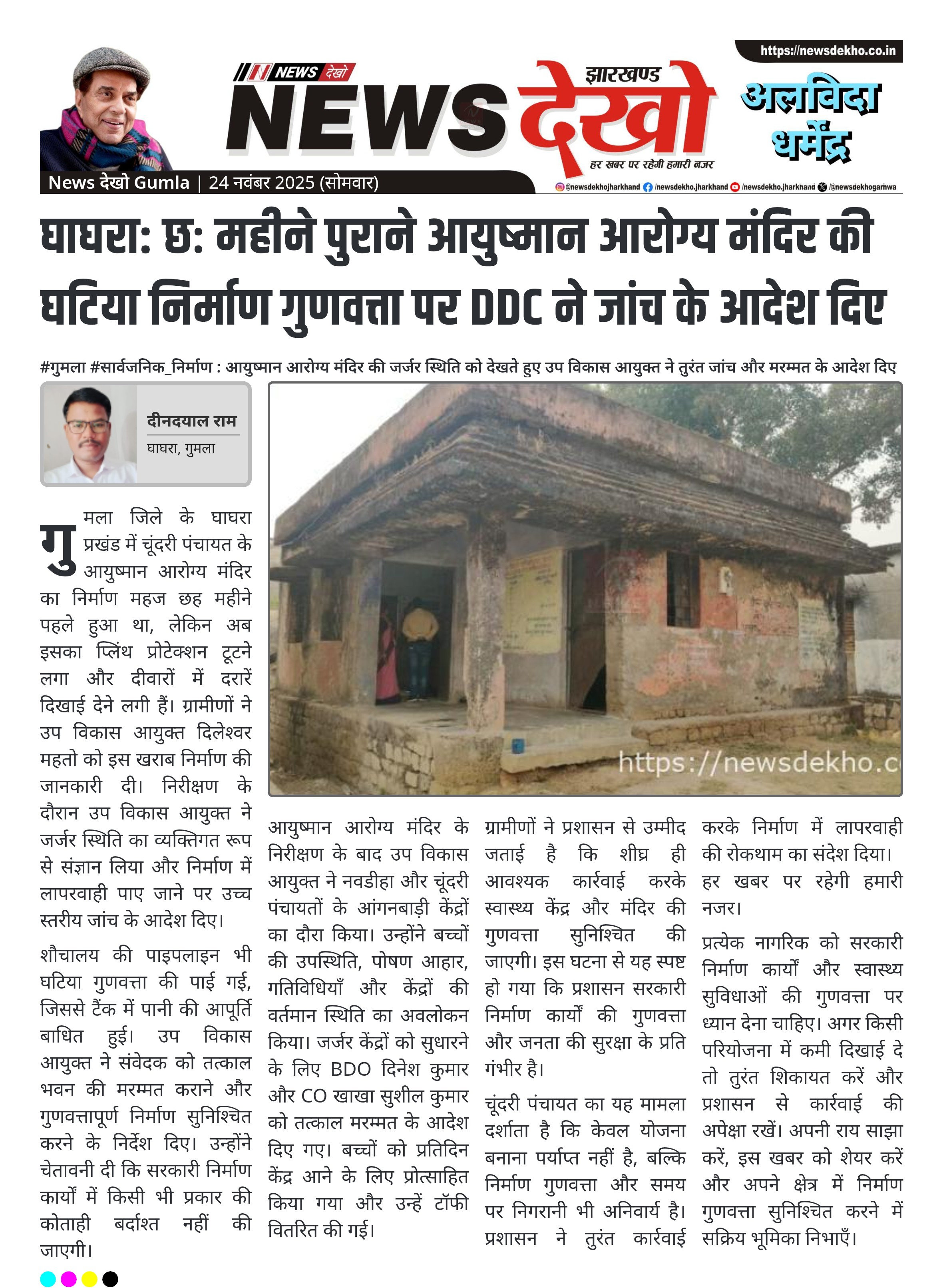 #गुमला #सार्वजनिक_निर्माण : आयुष्मान आरोग्य मंदिर की जर्जर स्थिति को देखते हुए उप विकास आयुक्त ने तुरंत जांच और मरम्मत के आदेश दिए घाघरा प्रखंड के चूंदरी पंचायत में आयुष्मान आरोग्य मंदिर की घटिया निर्माण गुणवत्ता सामने आई। केवल छह महीने में भवन का प्लिंथ प्रोटेक्शन टूट गया और दीवारों…