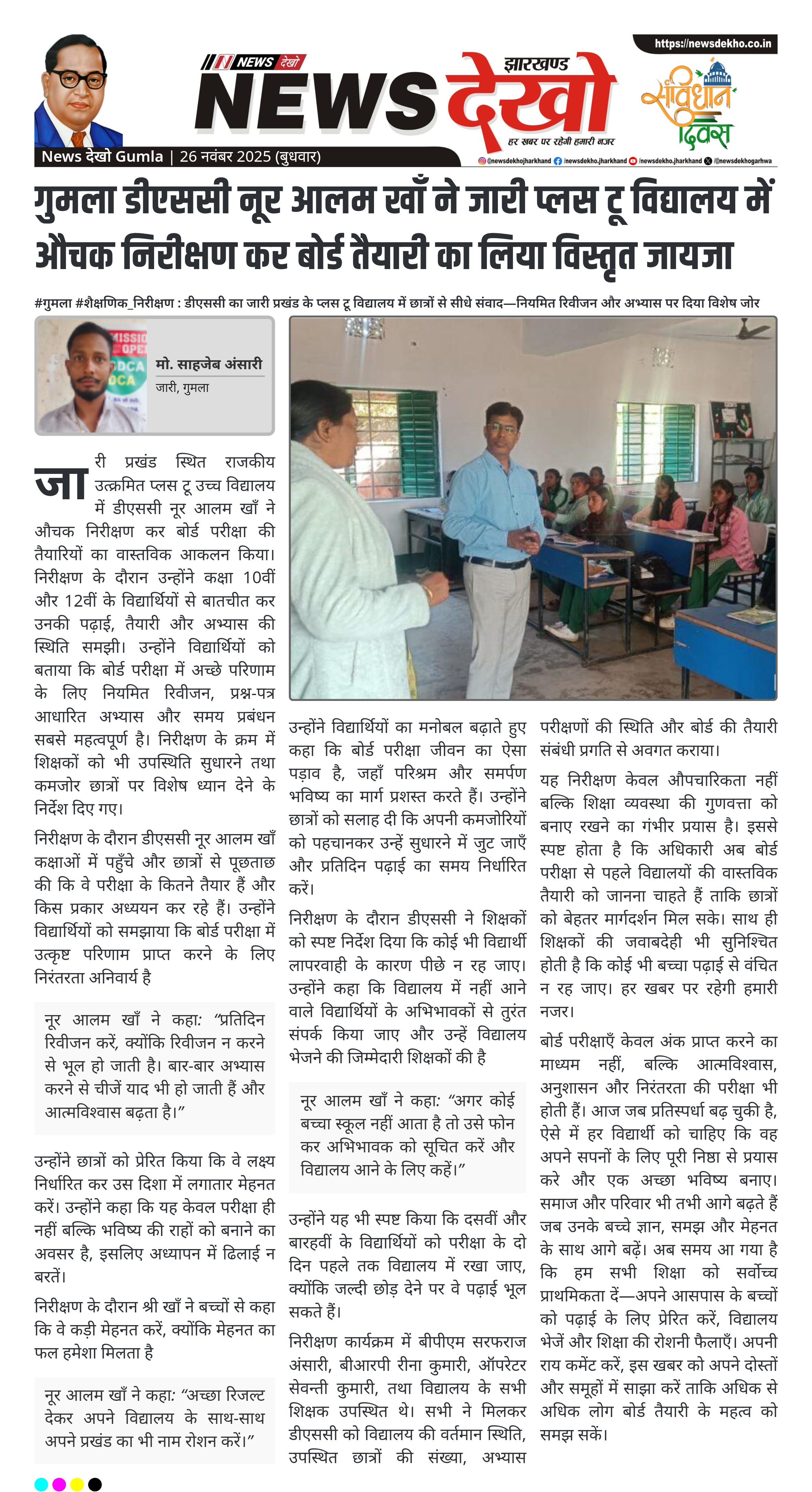 #गुमला #शैक्षणिक_निरीक्षण : डीएससी का जारी प्रखंड के प्लस टू विद्यालय में छात्रों से सीधे संवाद—नियमित रिवीजन और अभ्यास पर दिया विशेष जोर गुमला डीएससी नूर आलम खाँ ने राजकीय उत्क्रमित प्लस टू उच्च विद्यालय जारी का औचक निरीक्षण किया। कक्षा 10वीं और 12वीं के विद्यार्थियों से बोर्ड परीक्षा की…