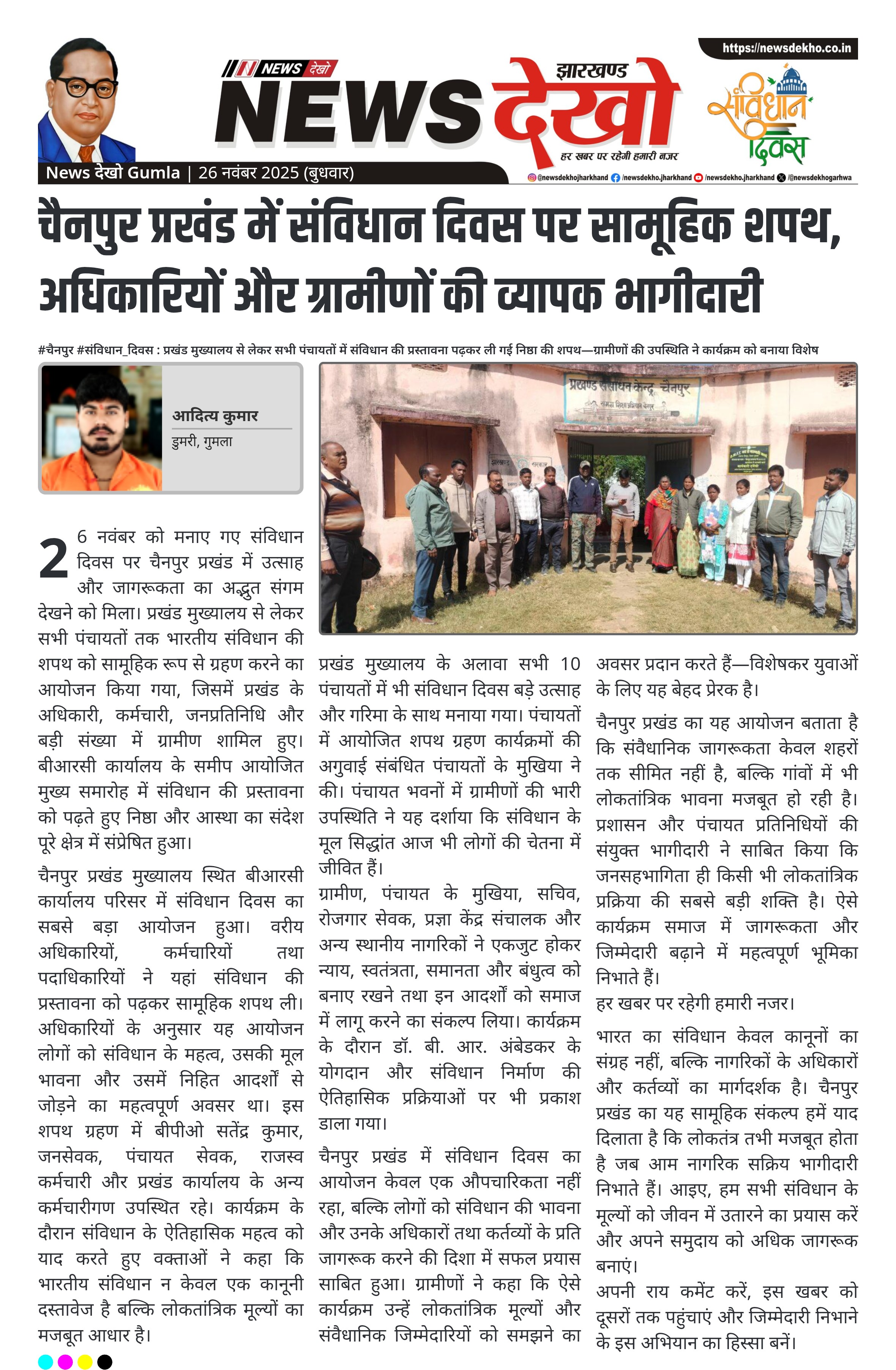 #चैनपुर #संविधान_दिवस : प्रखंड मुख्यालय से लेकर सभी पंचायतों में संविधान की प्रस्तावना पढ़कर ली गई निष्ठा की शपथ—ग्रामीणों की उपस्थिति ने कार्यक्रम को बनाया विशेष चैनपुर प्रखंड और इसकी 10 पंचायतों में संविधान दिवस पर विशेष आयोजन। बीआरसी कार्यालय परिसर में वरीय अधिकारियों और कर्मचारियों ने संविधान की प्रस्तावना…
