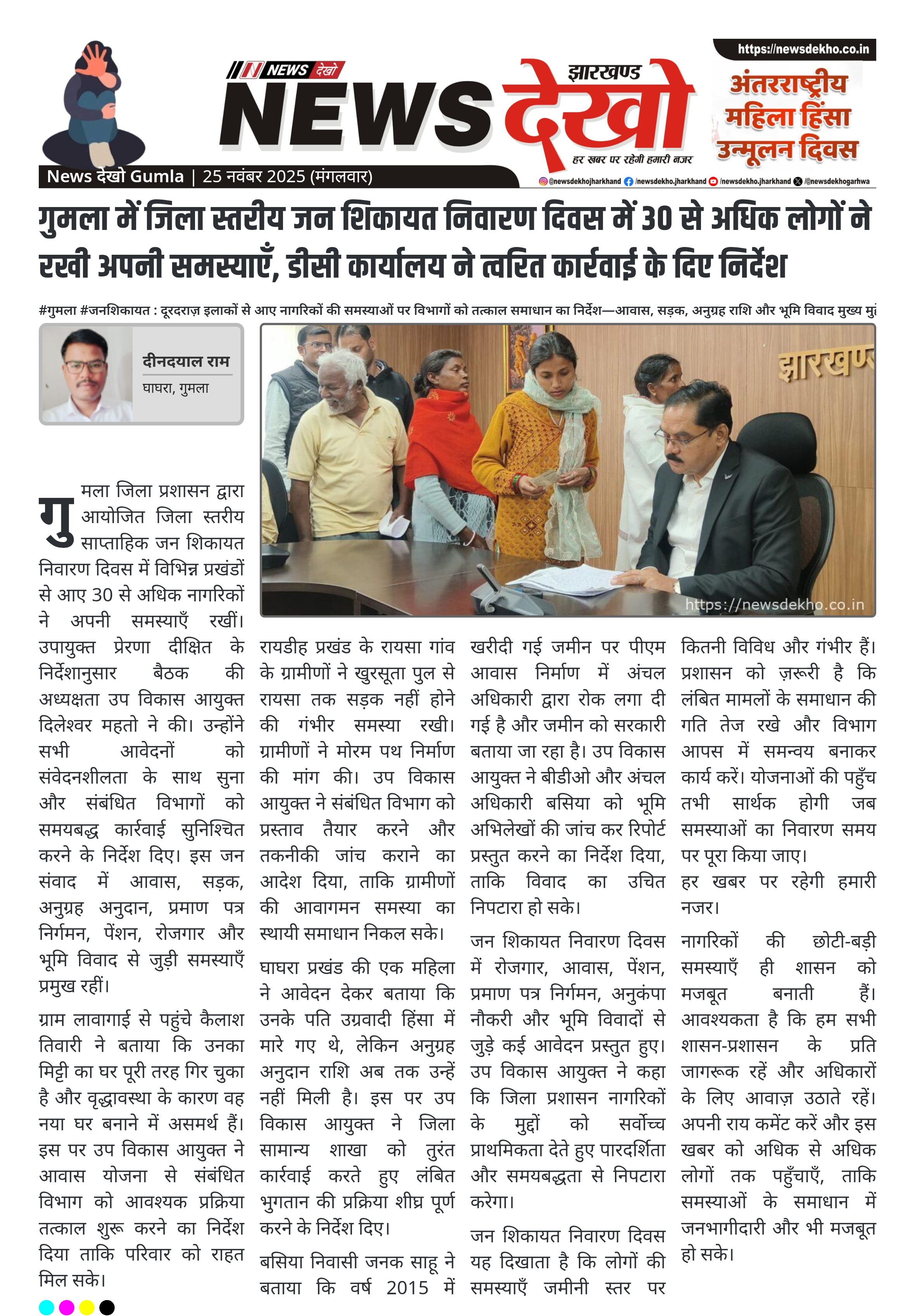 #गुमला #जनशिकायत : दूरदराज़ इलाकों से आए नागरिकों की समस्याओं पर विभागों को तत्काल समाधान का निर्देश—आवास, सड़क, अनुग्रह राशि और भूमि विवाद मुख्य मुद्दे। 30 से अधिक नागरिकों ने जन शिकायत निवारण दिवस में दर्ज कराई समस्याएँ। उप विकास आयुक्त दिलेश्वर महतो ने सभी आवेदनों को गंभीरता से सुना।…