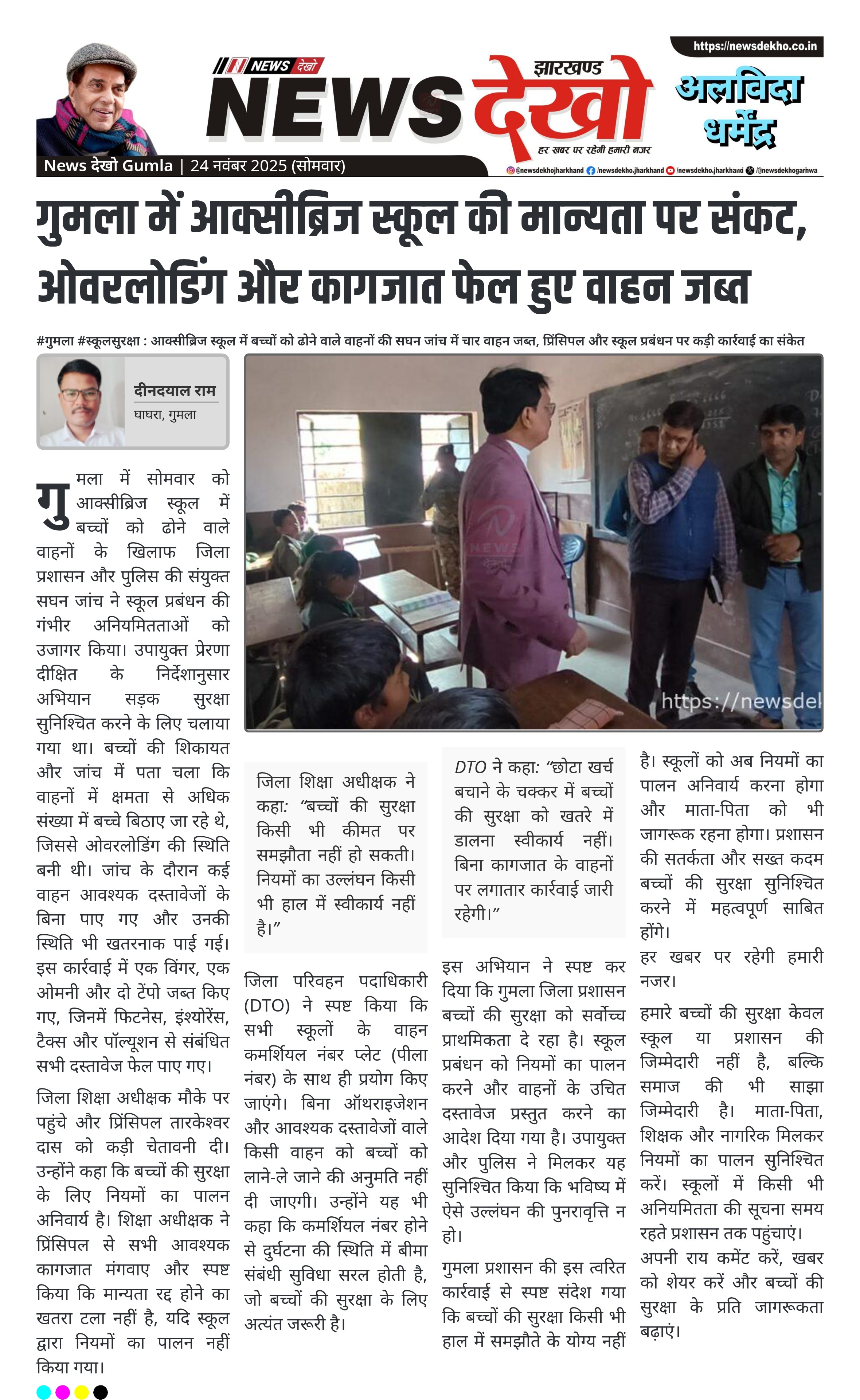 गुमला में आक्सीब्रिज स्कूल की मान्यता पर संकट, ओवरलोडिंग और कागजात फेल हुए वाहन जब्त