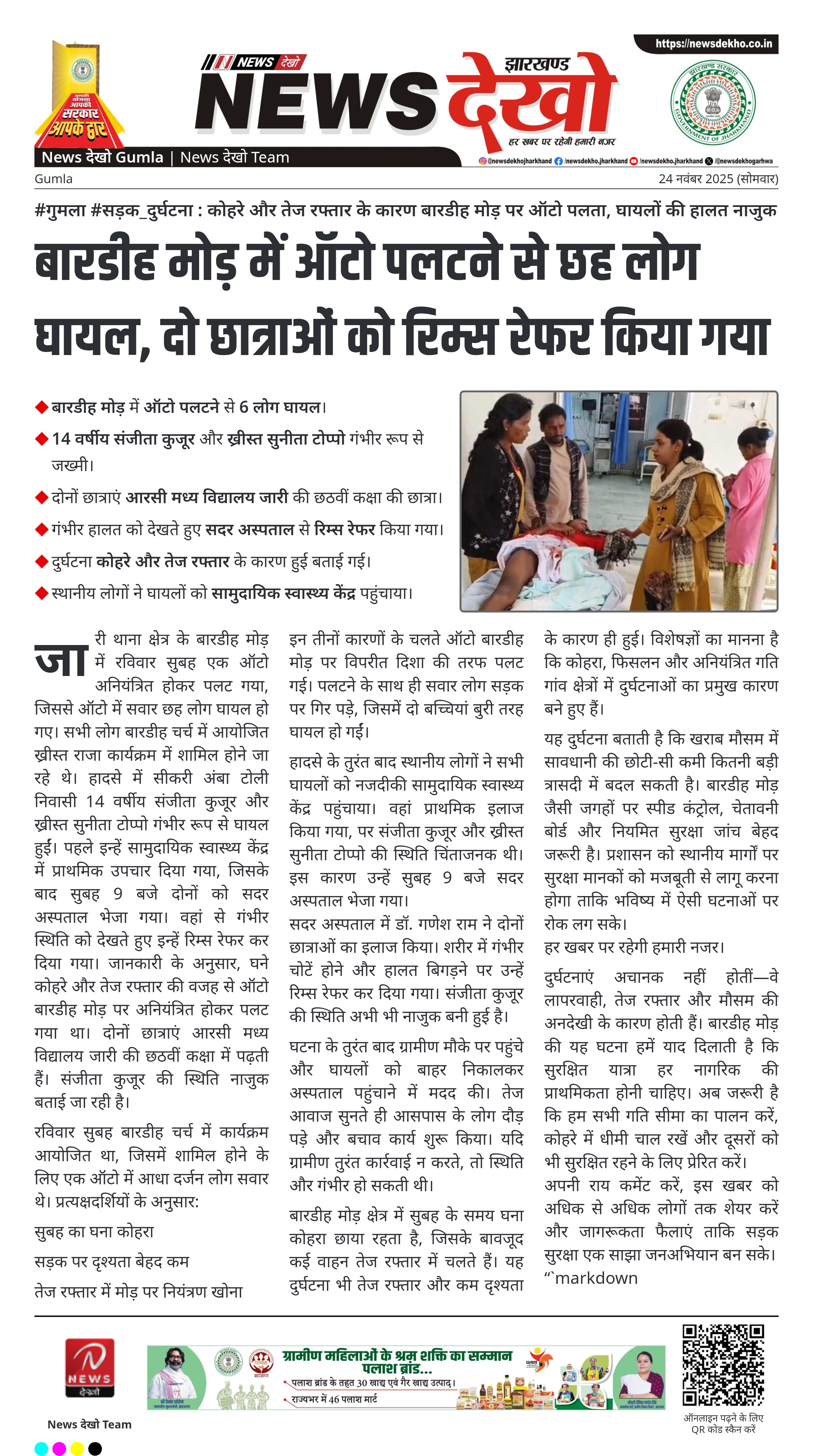 बारडीह मोड़ में ऑटो पलटने से छह लोग घायल, दो छात्राओं को रिम्स रेफर किया गया