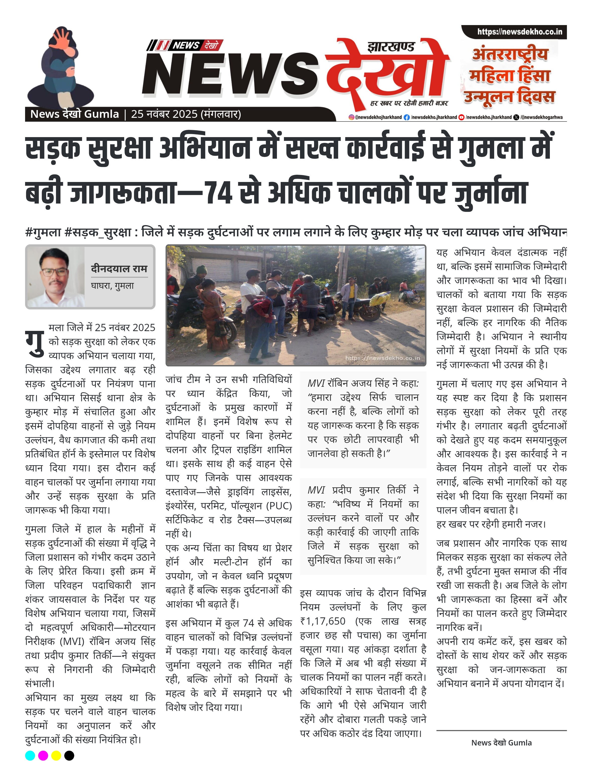 सड़क सुरक्षा अभियान में सख्त कार्रवाई से गुमला में बढ़ी जागरूकता—74 से अधिक चालकों पर जुर्माना