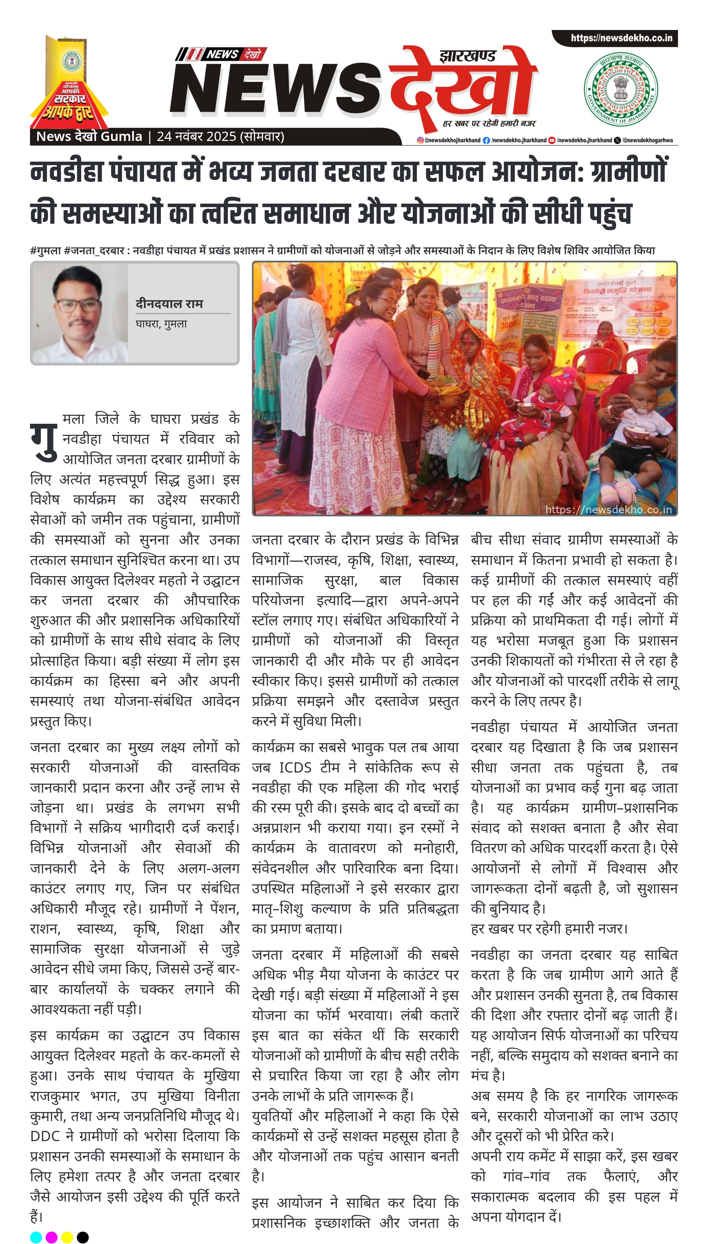 #गुमला #जनता_दरबार : नवडीहा पंचायत में प्रखंड प्रशासन ने ग्रामीणों को योजनाओं से जोड़ने और समस्याओं के निदान के लिए विशेष शिविर आयोजित किया गुमला के घाघरा प्रखंड के नवडीहा पंचायत में भव्य जनता दरबार का सफल आयोजन हुआ। कार्यक्रम का उद्घाटन उप विकास आयुक्त (DDC) दिलेश्वर महतो ने किया।…