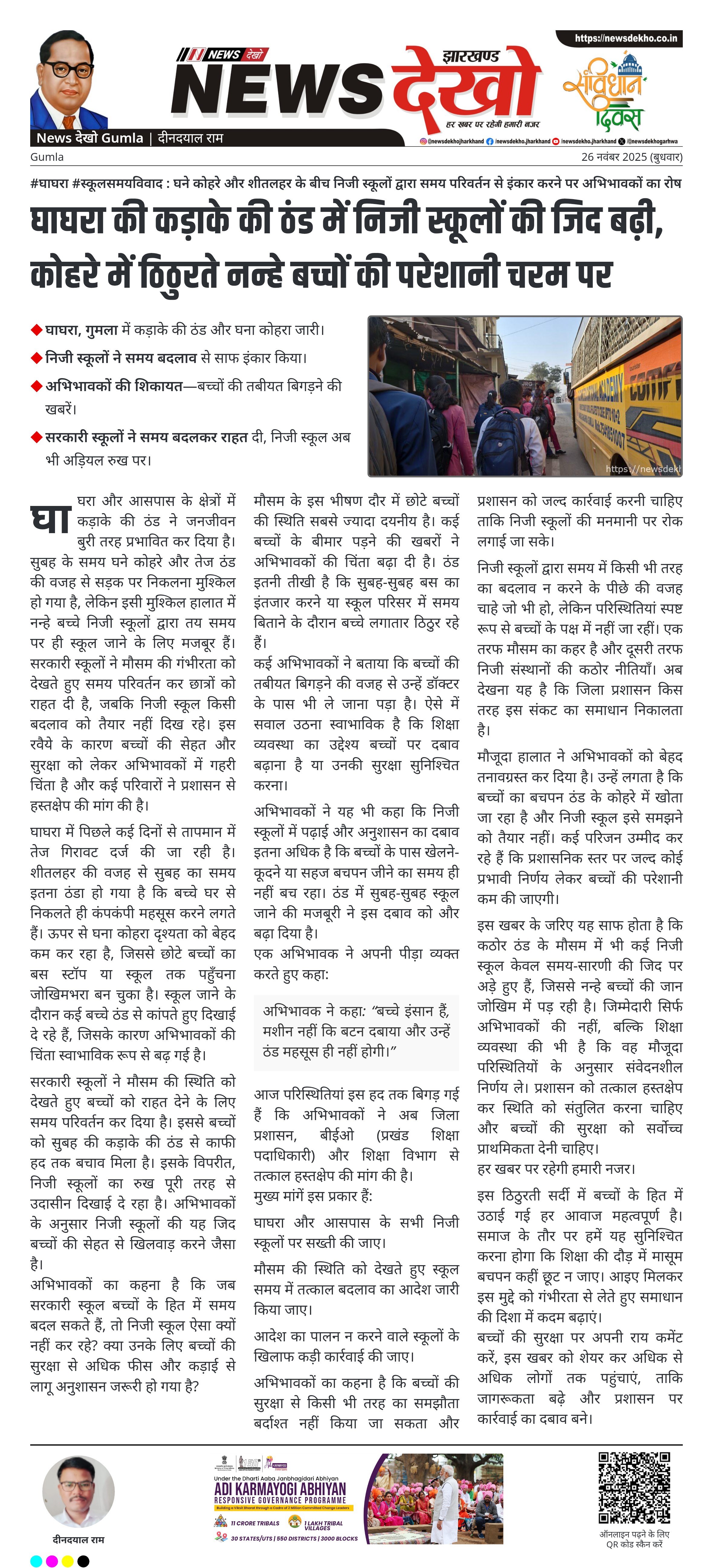 #घाघरा #स्कूलसमयविवाद : घने कोहरे और शीतलहर के बीच निजी स्कूलों द्वारा समय परिवर्तन से इंकार करने पर अभिभावकों का रोष बढ़ा—बच्चों की सुरक्षा को लेकर प्रशासन से हस्तक्षेप की मांग तेज। घाघरा, गुमला में कड़ाके की ठंड और घना कोहरा जारी। निजी स्कूलों ने समय बदलाव से साफ इंकार…