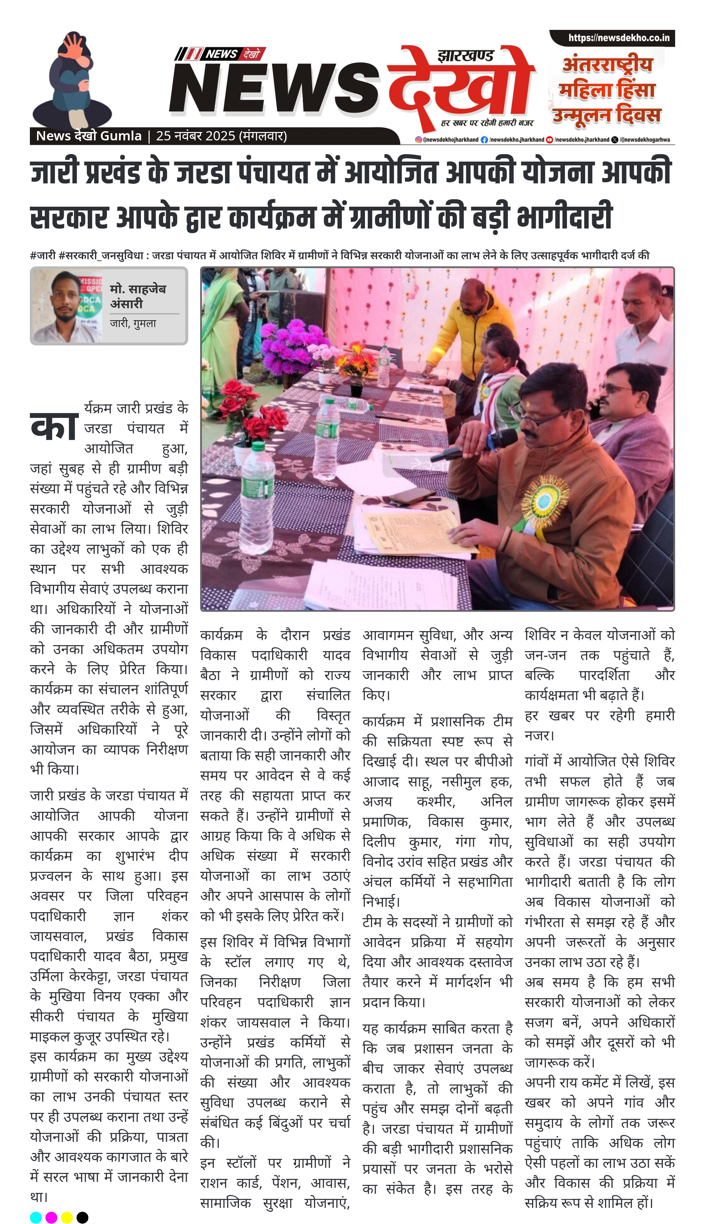 #जारी #सरकारी_जनसुविधा : जरडा पंचायत में आयोजित शिविर में ग्रामीणों ने विभिन्न सरकारी योजनाओं का लाभ लेने के लिए उत्साहपूर्वक भागीदारी दर्ज की जारी प्रखंड, जरडा पंचायत में सरकारी शिविर का आयोजन। ग्रामीणों की भारी उपस्थिति, योजनाओं का लाभ उठाया गया। ज्ञान शंकर जायसवाल, यादव बैठा, उर्मिला केरकेट्टा सहित कई…