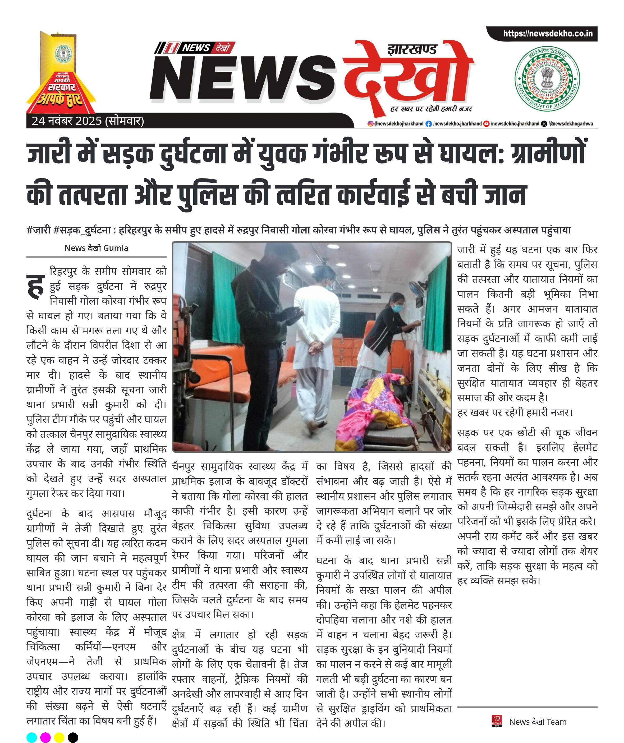 #जारी #सड़क_दुर्घटना : हरिहरपुर के समीप हुए हादसे में रुद्रपुर निवासी गोला कोरवा गंभीर रूप से घायल, पुलिस ने तुरंत पहुंचकर अस्पताल पहुंचाया जारी थाना क्षेत्र के हरिहरपुर के पास सड़क दुर्घटना। रुद्रपुर निवासी गोला कोरवा (30 वर्ष) गंभीर रूप से घायल। विपरीत दिशा से आ रहे वाहन ने जोरदार…