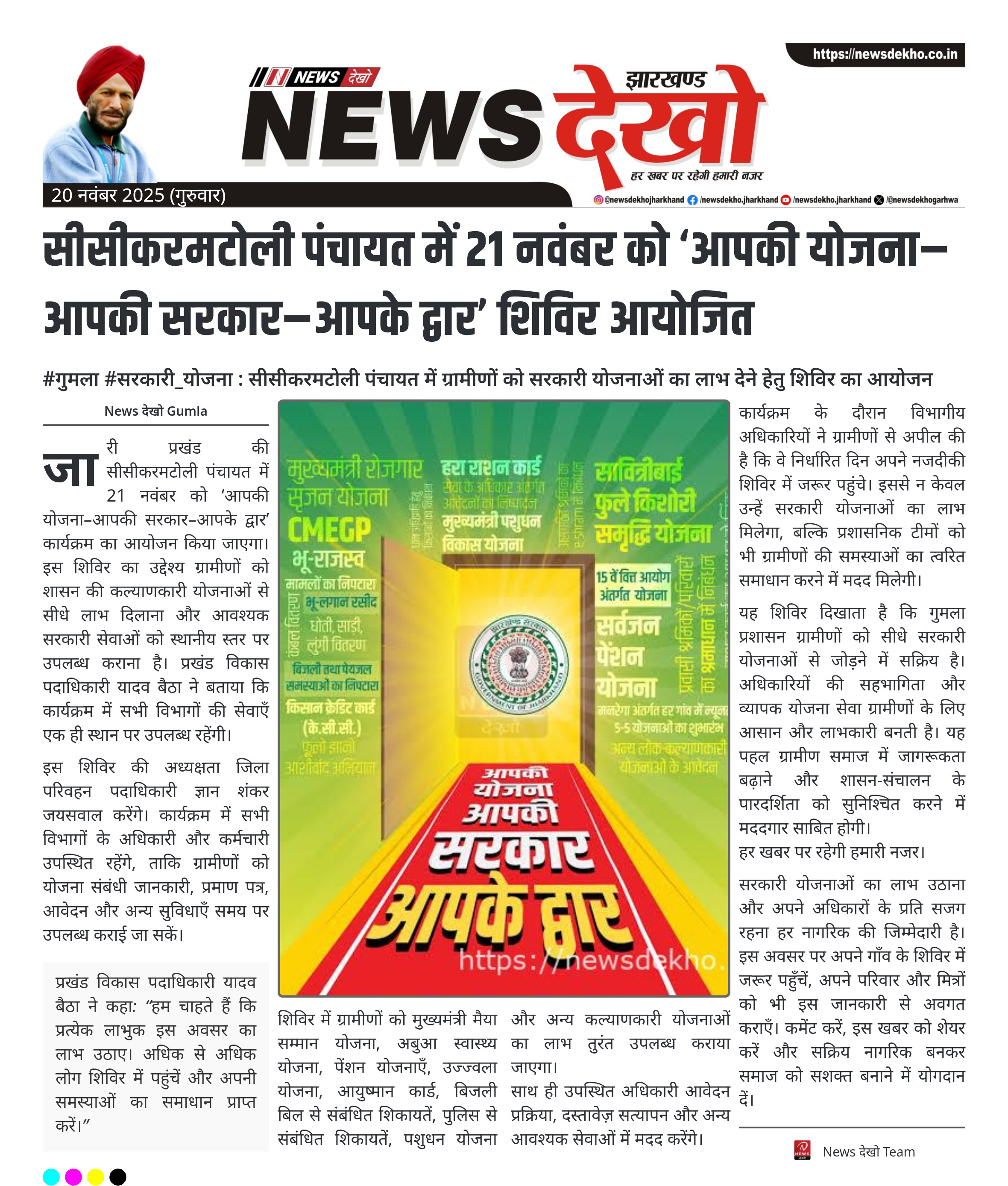 #गुमला #सरकारी_योजना : सीसीकरमटोली पंचायत में ग्रामीणों को सरकारी योजनाओं का लाभ देने हेतु शिविर का आयोजन शिविर की तिथि: 21 नवंबर 2025। स्थान: सीसीकरमटोली पंचायत, जारी प्रखंड। कार्यक्रम की अध्यक्षता करेंगे जिला परिवहन पदाधिकारी ज्ञान शंकर जयसवाल। प्रखंड विकास पदाधिकारी यादव बैठा ने ग्रामीणों को अधिक भागीदारी की अपील…