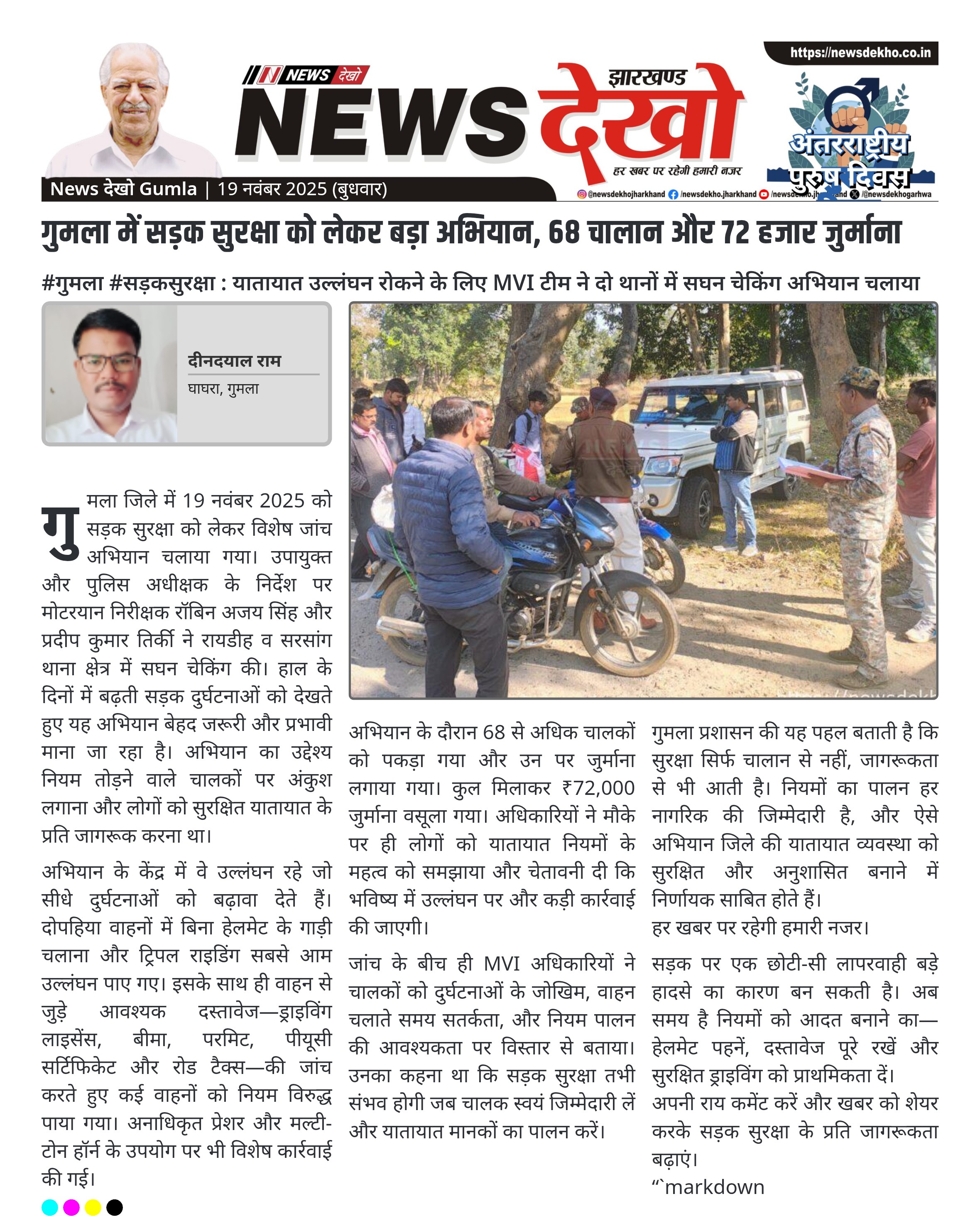 #गुमला #सड़कसुरक्षा : यातायात उल्लंघन रोकने के लिए MVI टीम ने दो थानों में सघन चेकिंग अभियान चलाया 19 नवंबर 2025 को व्यापक सड़क सुरक्षा अभियान। MVI रॉबिन अजय सिंह व प्रदीप कुमार तिर्की ने कार्रवाई की। हेलमेट नहीं पहनने व ट्रिपल राइडिंग पर फोकस। अवैध हॉर्न और अमान्य कागजात…