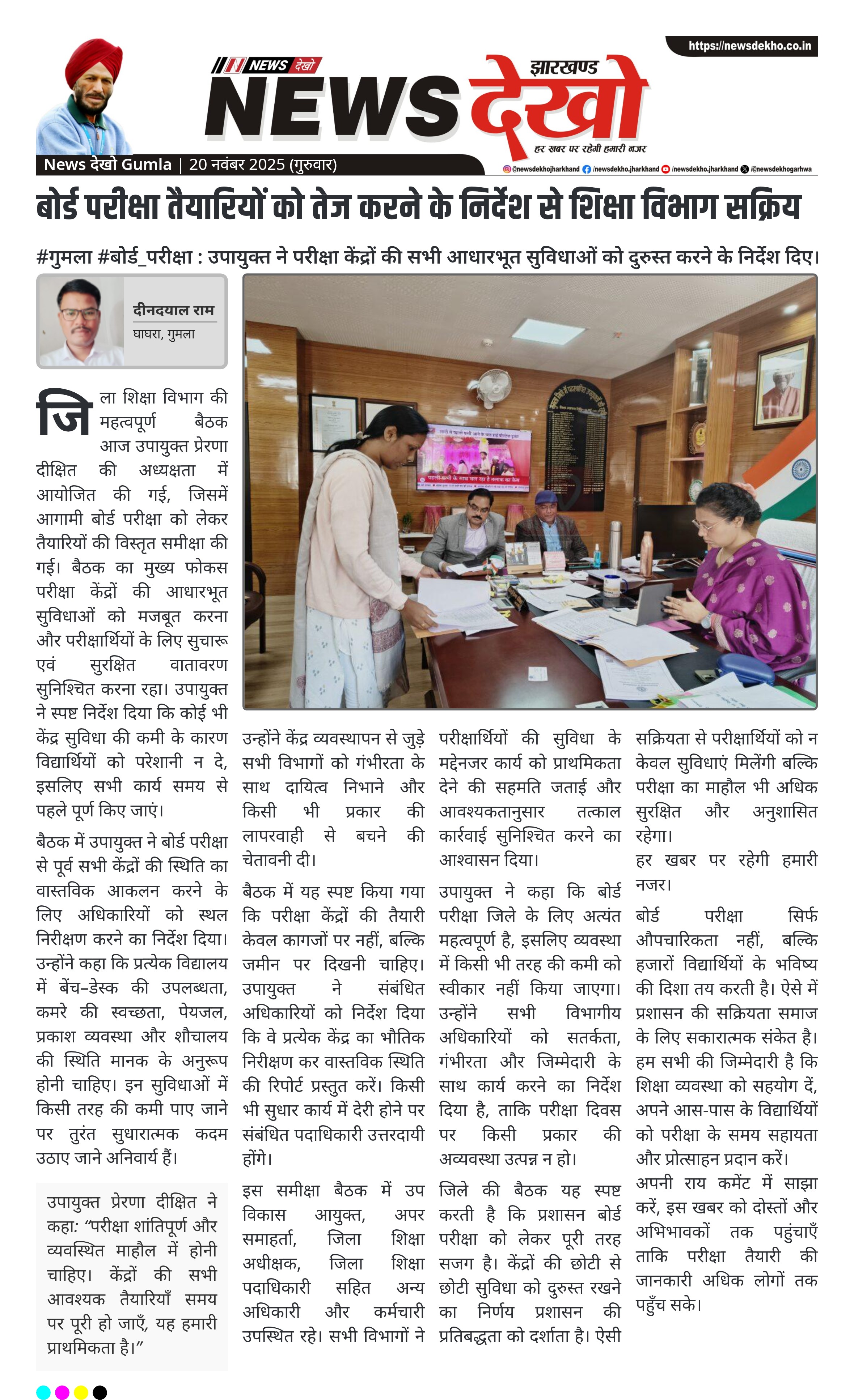 #गुमला #बोर्ड_परीक्षा : उपायुक्त ने परीक्षा केंद्रों की सभी आधारभूत सुविधाओं को दुरुस्त करने के निर्देश दिए। उपायुक्त प्रेरणा दीक्षित की अध्यक्षता में बैठक आयोजित। केंद्रों में बेंच–डेस्क, स्वच्छता, पेयजल, प्रकाश सुधारने के आदेश। अधिकारियों को स्थलीय निरीक्षण कर रिपोर्ट देने का निर्देश। परीक्षा केंद्रों की तैयारी समयबद्ध रूप से…