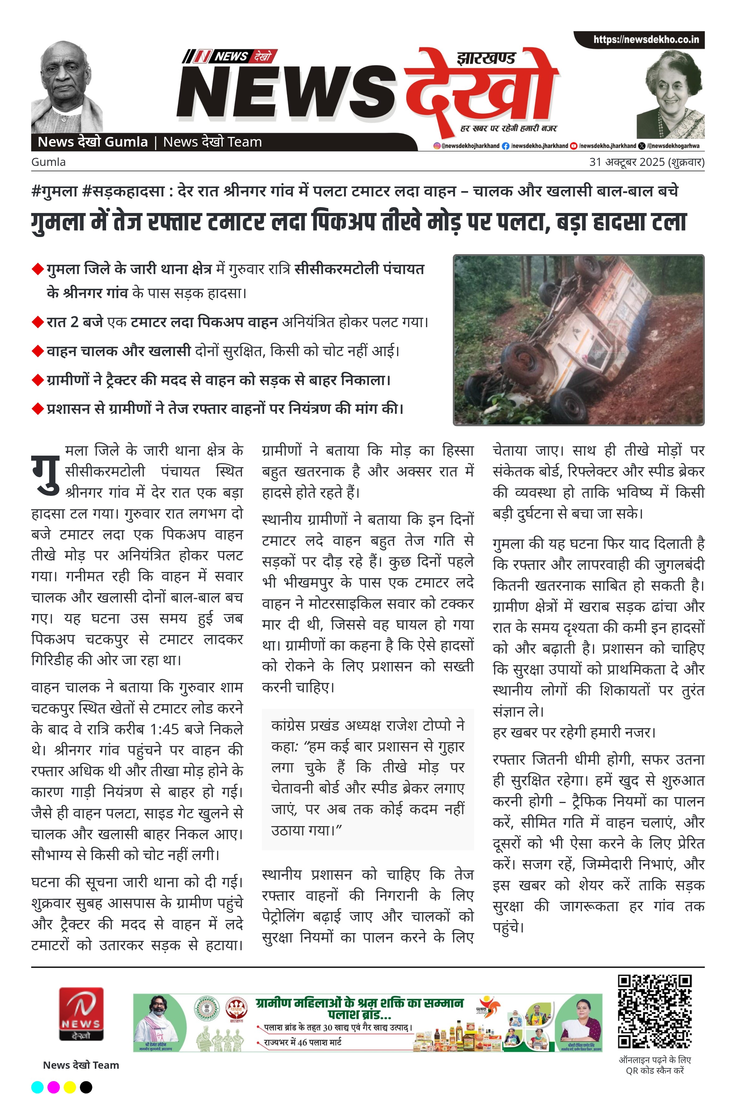 #गुमला #सड़कहादसा : देर रात श्रीनगर गांव में पलटा टमाटर लदा वाहन – चालक और खलासी बाल-बाल बचे गुमला जिले के जारी थाना क्षेत्र में गुरुवार रात्रि सीसीकरमटोली पंचायत के श्रीनगर गांव के पास सड़क हादसा। रात 2 बजे एक टमाटर लदा पिकअप वाहन अनियंत्रित होकर पलट गया। वाहन चालक…