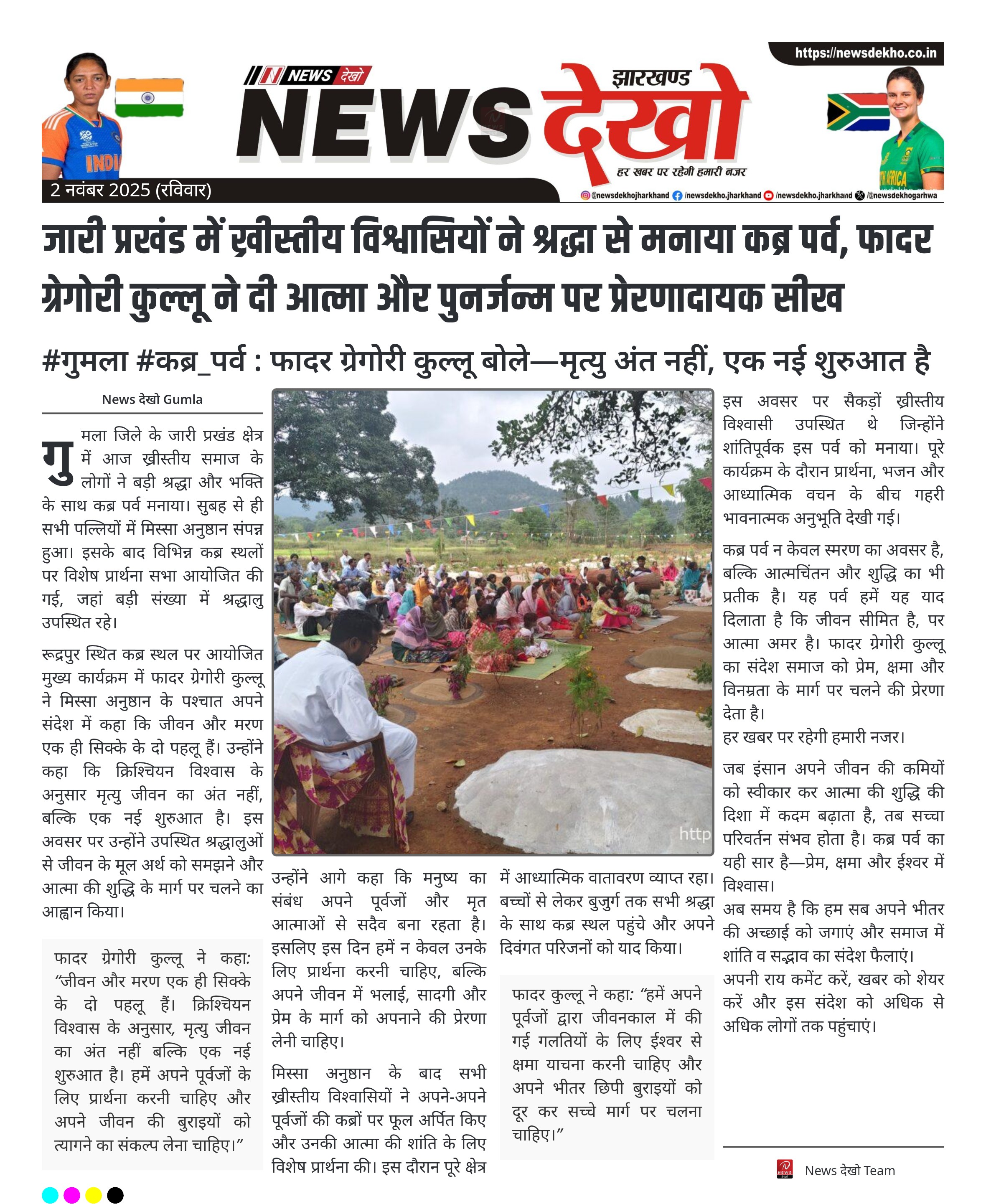#गुमला #कब्र_पर्व : फादर ग्रेगोरी कुल्लू बोले—मृत्यु अंत नहीं, एक नई शुरुआत है जारी प्रखंड क्षेत्र में ख्रीस्तीय विश्वासियों ने श्रद्धा और भक्ति के साथ कब्र पर्व मनाया। दिन की शुरुआत सभी पल्लियों में मिस्सा अनुष्ठान से हुई। रूद्रपुर कब्र स्थल पर हुई विशेष प्रार्थना सभा में फादर ग्रेगोरी कुल्लू…