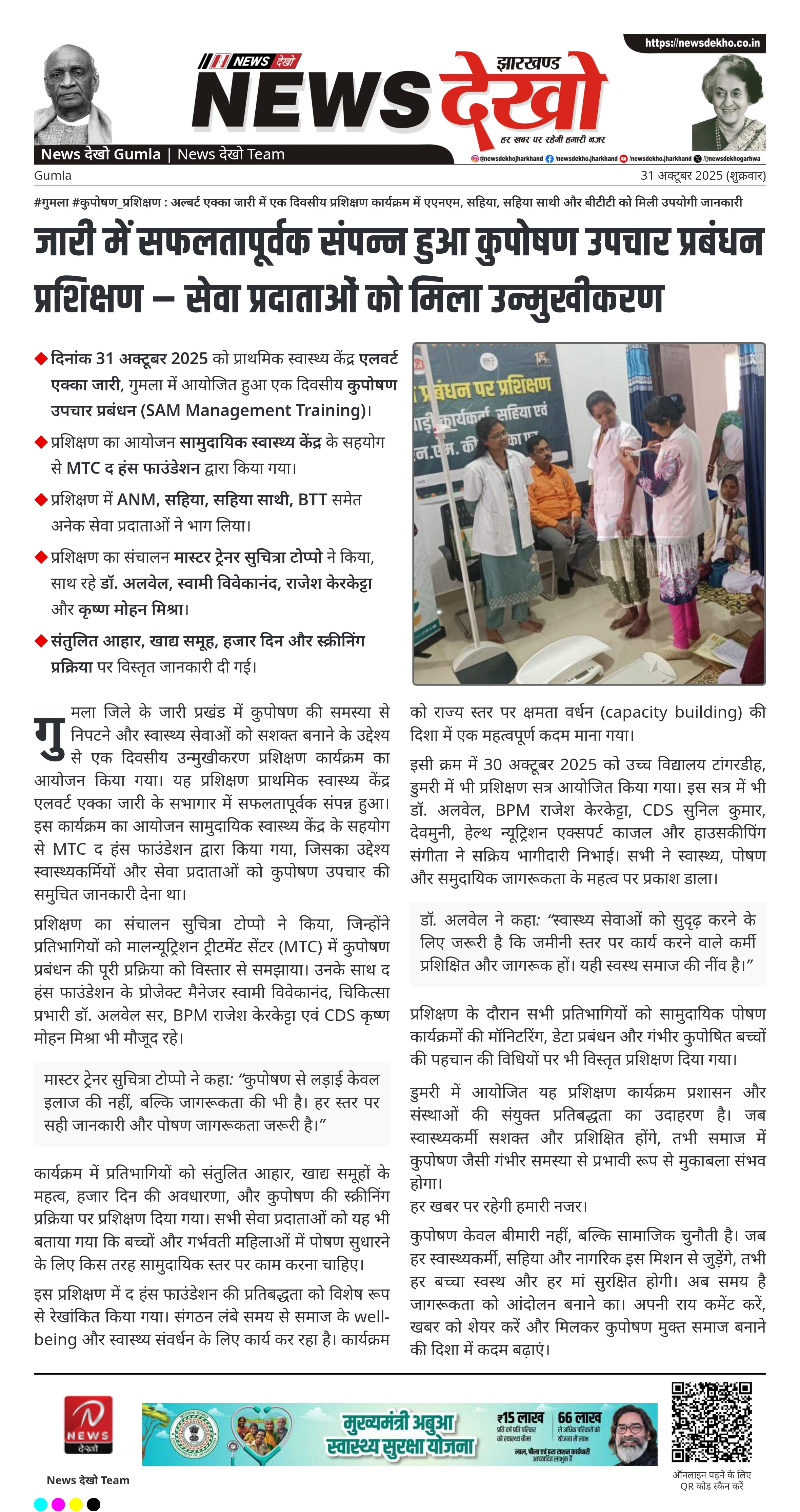 #गुमला #कुपोषण_प्रशिक्षण : अल्बर्ट एक्का जारी में एक दिवसीय प्रशिक्षण कार्यक्रम में एएनएम, सहिया, सहिया साथी और बीटीटी को मिली उपयोगी जानकारी दिनांक 31 अक्टूबर 2025 को प्राथमिक स्वास्थ्य केंद्र एलवर्ट एक्का जारी, गुमला में आयोजित हुआ एक दिवसीय कुपोषण उपचार प्रबंधन (SAM Management Training)। प्रशिक्षण का आयोजन सामुदायिक स्वास्थ्य…