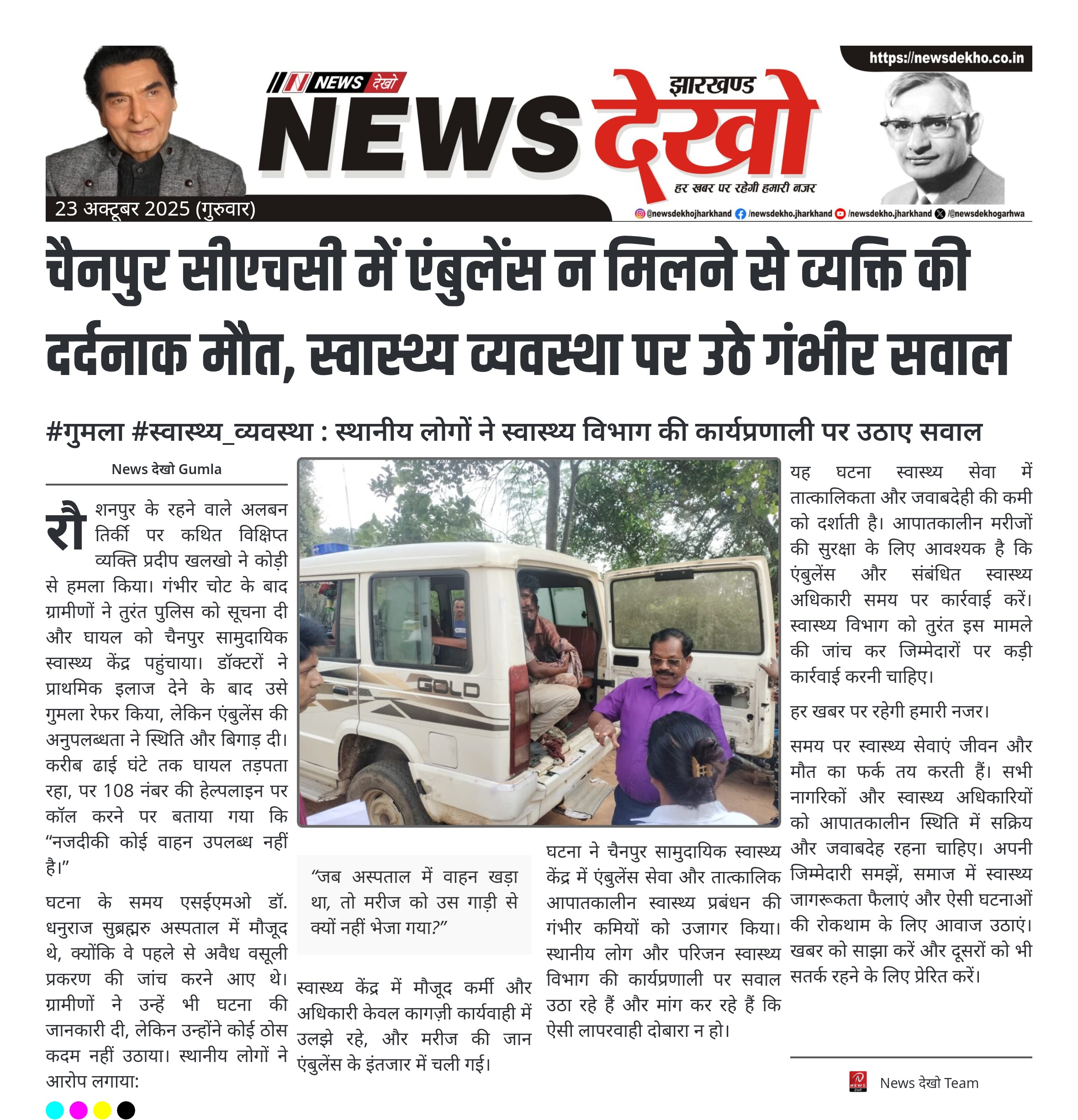 #गुमला #स्वास्थ्य_व्यवस्था : स्थानीय लोगों ने स्वास्थ्य विभाग की कार्यप्रणाली पर उठाए सवाल रौशनपुर में 55 वर्षीय अलबन तिर्की पर सिर पर हमला हुआ और उसे चैनपुर सीएचसी लाया गया। प्राथमिक उपचार के बाद मरीज को गुमला रेफर किया गया, लेकिन 108 एंबुलेंस नहीं पहुंची। एंबुलेंस आने में ढाई घंटे…