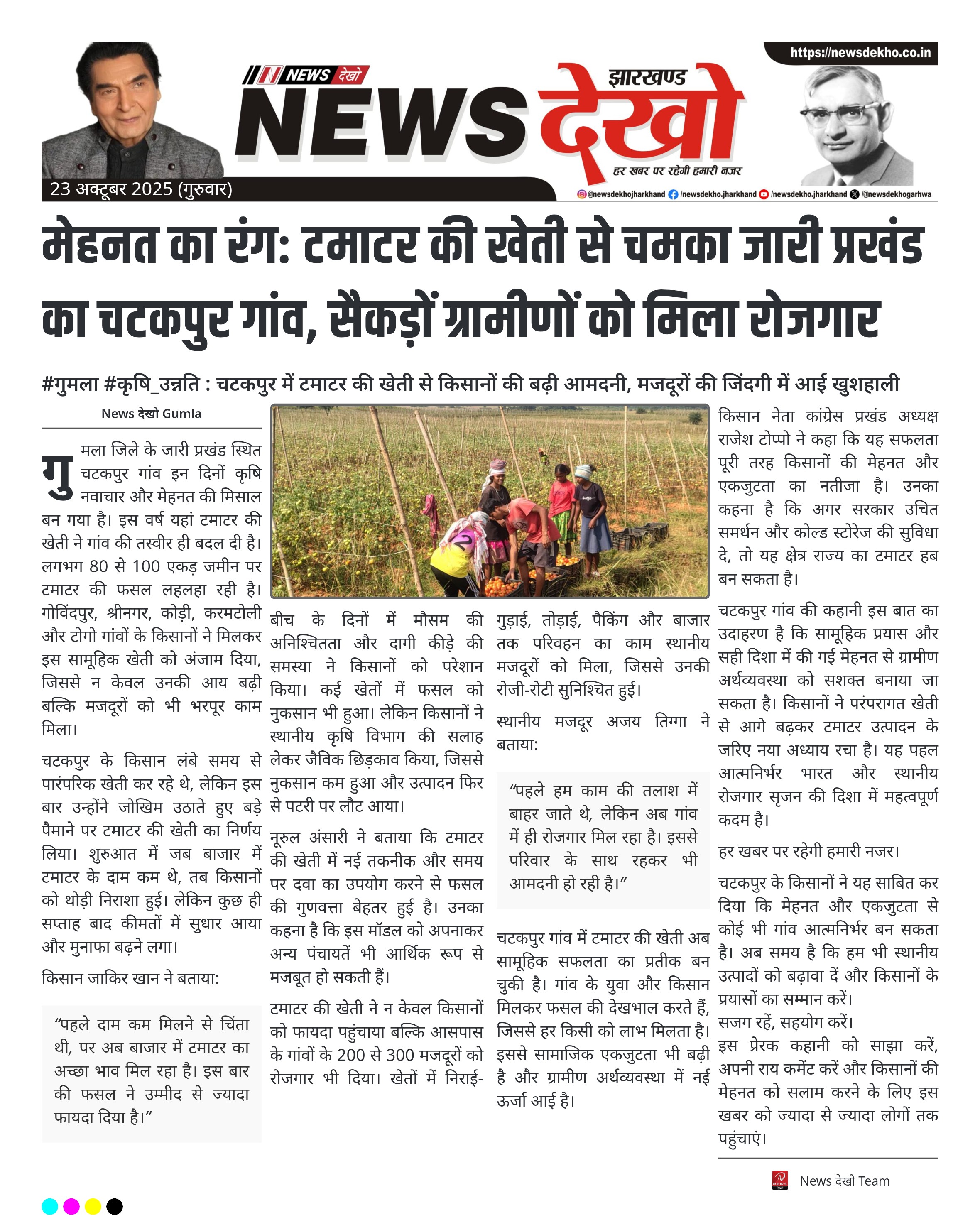#गुमला #कृषि_उन्नति : चटकपुर में टमाटर की खेती से किसानों की बढ़ी आमदनी, मजदूरों की जिंदगी में आई खुशहाली जारी प्रखंड के चटकपुर गांव में 100 एकड़ तक फैली टमाटर की फसल ने दिखाई समृद्धि की राह। गोविंदपुर और आसपास के गांवों के किसानों की साझा मेहनत से टमाटर की…