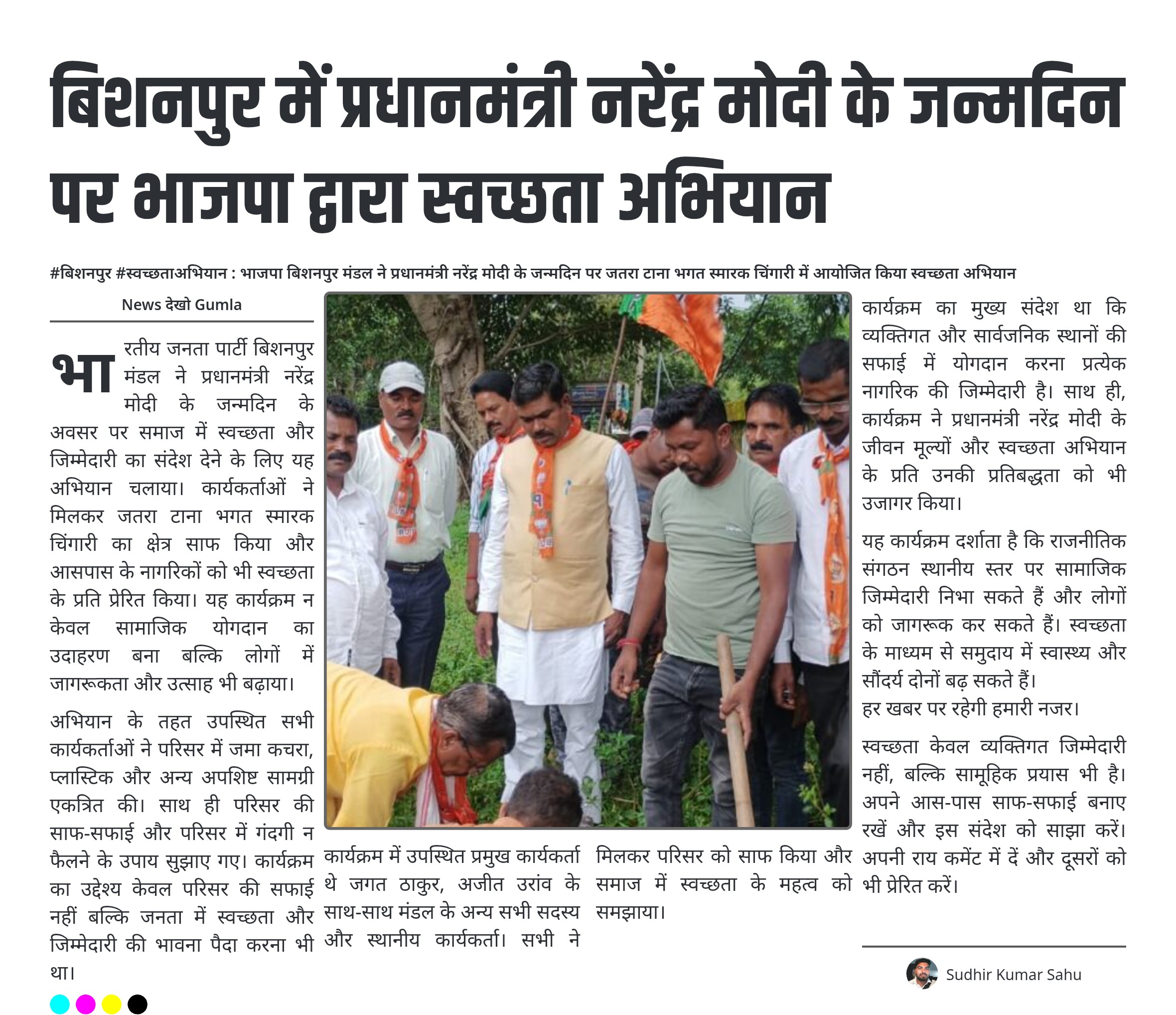 #बिशनपुर #स्वच्छताअभियान : भाजपा बिशनपुर मंडल ने प्रधानमंत्री नरेंद्र मोदी के जन्मदिन पर जतरा टाना भगत स्मारक चिंगारी में आयोजित किया स्वच्छता अभियान 17 सितंबर 2025, बुधवार को प्रधानमंत्री नरेंद्र मोदी के जन्मदिन के अवसर पर भारतीय जनता पार्टी बिशनपुर मंडल ने स्वच्छता अभियान आयोजित किया। अभियान का आयोजन जतरा…