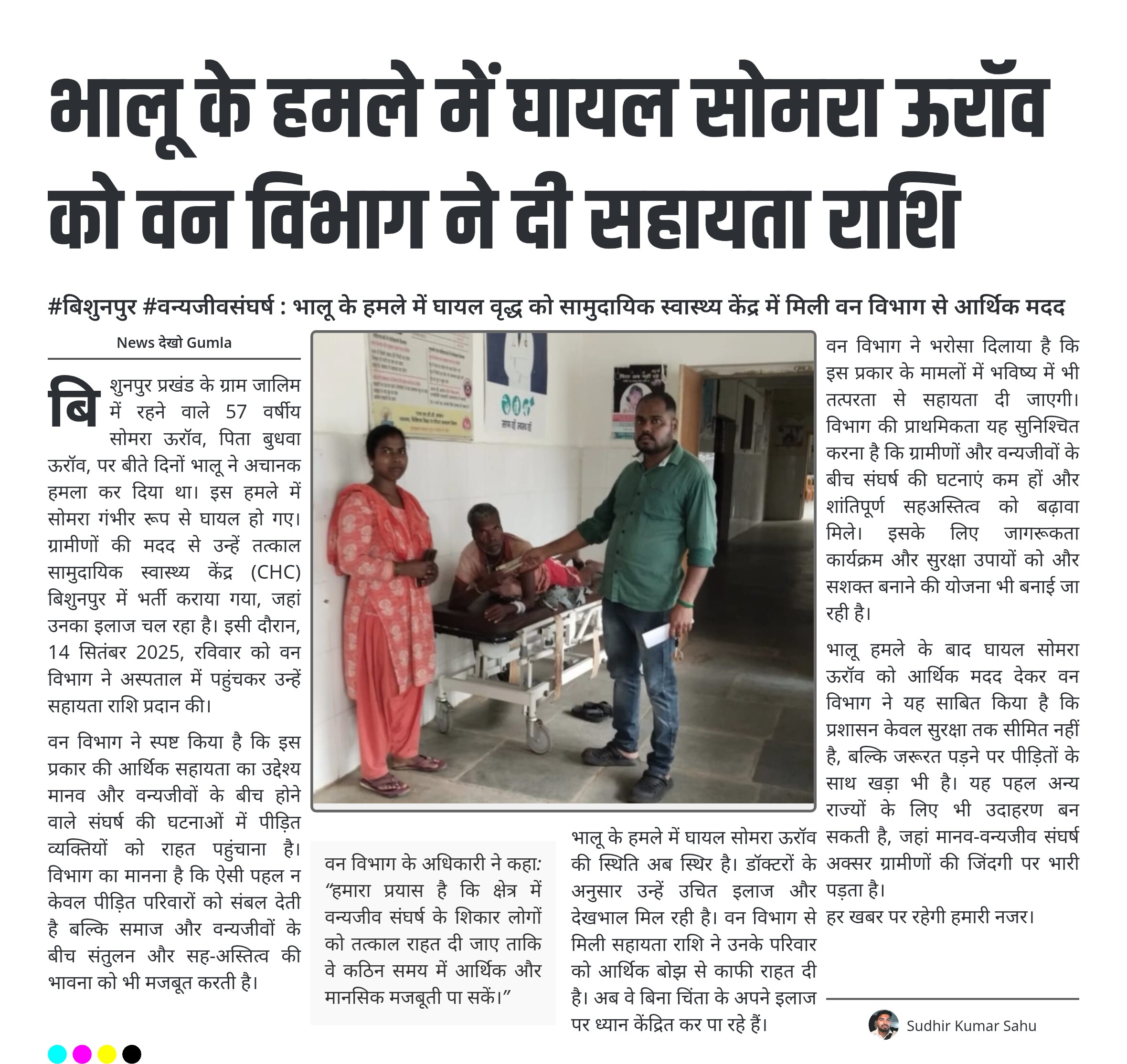 #बिशुनपुर #वन्यजीवसंघर्ष : भालू के हमले में घायल वृद्ध को सामुदायिक स्वास्थ्य केंद्र में मिली वन विभाग से आर्थिक मदद ग्राम जालिम, बिशुनपुर के निवासी 57 वर्षीय सोमरा ऊरॉव पर भालू ने हमला कर दिया। उन्हें गंभीर चोटें आईं और इलाज के लिए सामुदायिक स्वास्थ्य केंद्र (CHC) बिशुनपुर में भर्ती…