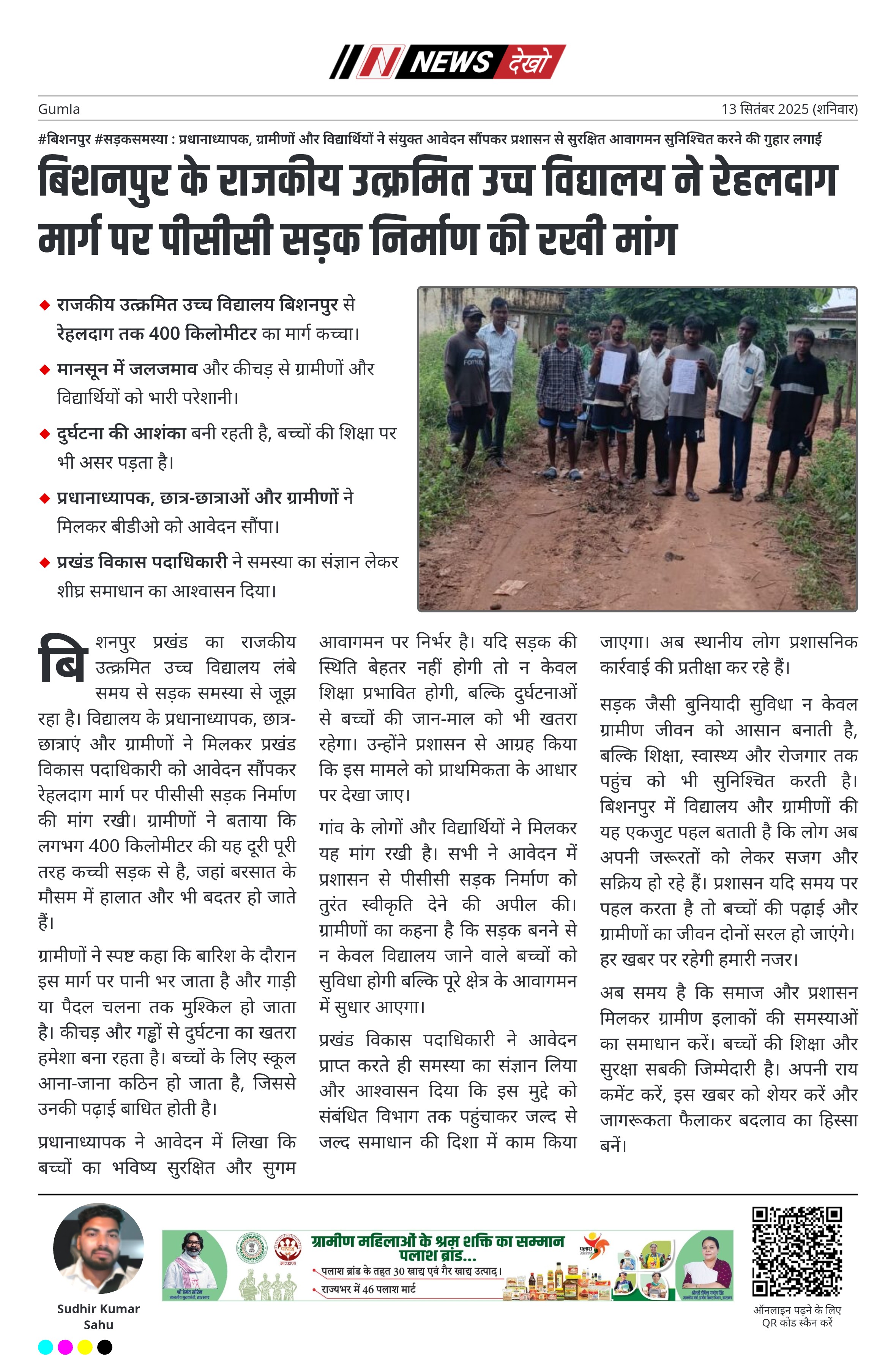 बिशनपुर के राजकीय उत्क्रमित उच्च विद्यालय ने रेहलदाग मार्ग पर पीसीसी सड़क निर्माण की रखी मांग