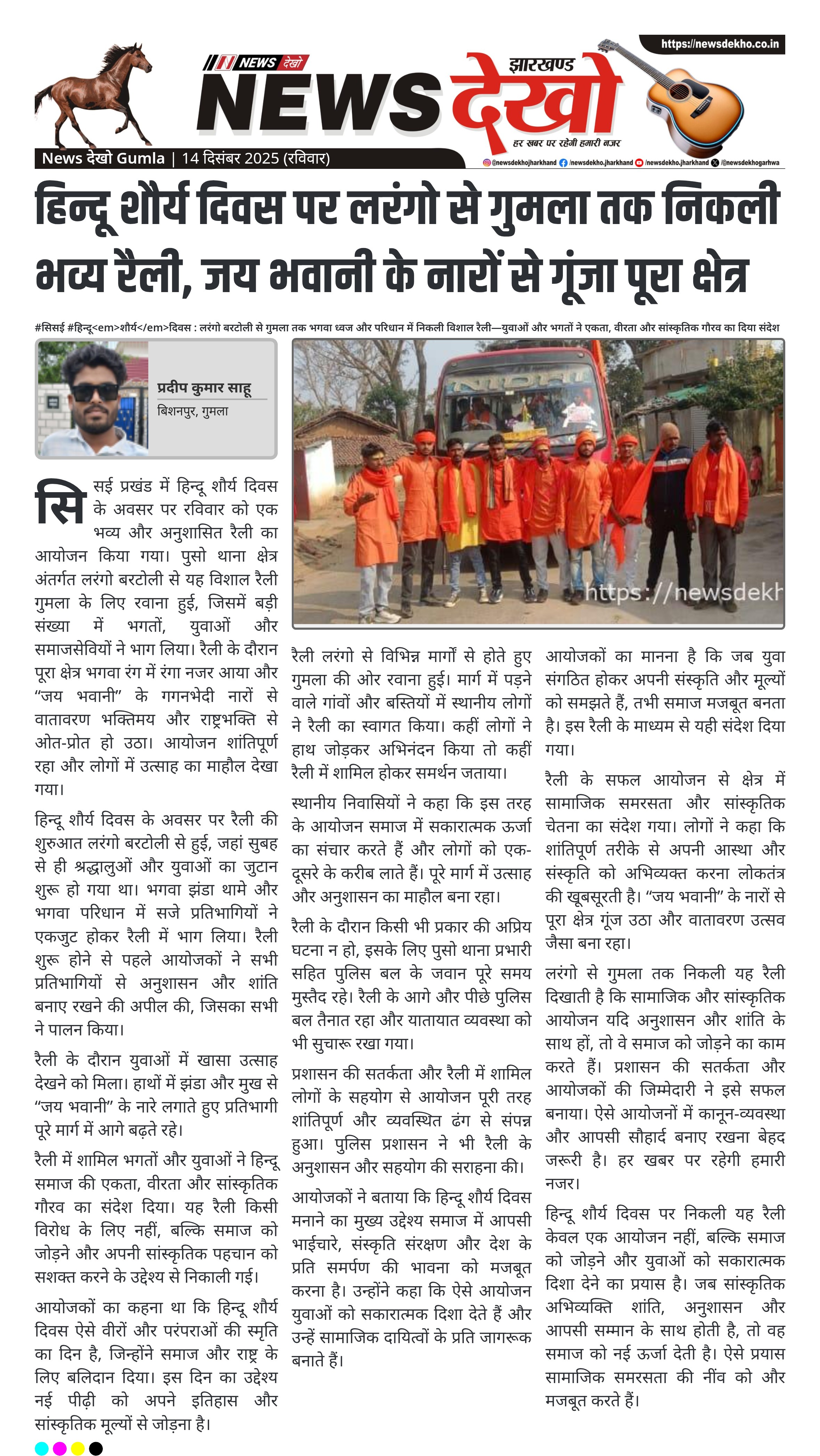 #सिसई #हिन्दूशौर्यदिवस : लरंगो बरटोली से गुमला तक भगवा ध्वज और परिधान में निकली विशाल रैली—युवाओं और भगतों ने एकता, वीरता और सांस्कृतिक गौरव का दिया संदेश सिसई प्रखंड के पुसो थाना क्षेत्र अंतर्गत लरंगो बरटोली से रैली की शुरुआत। हिन्दू शौर्य दिवस के अवसर पर बड़ी संख्या में भगत…
