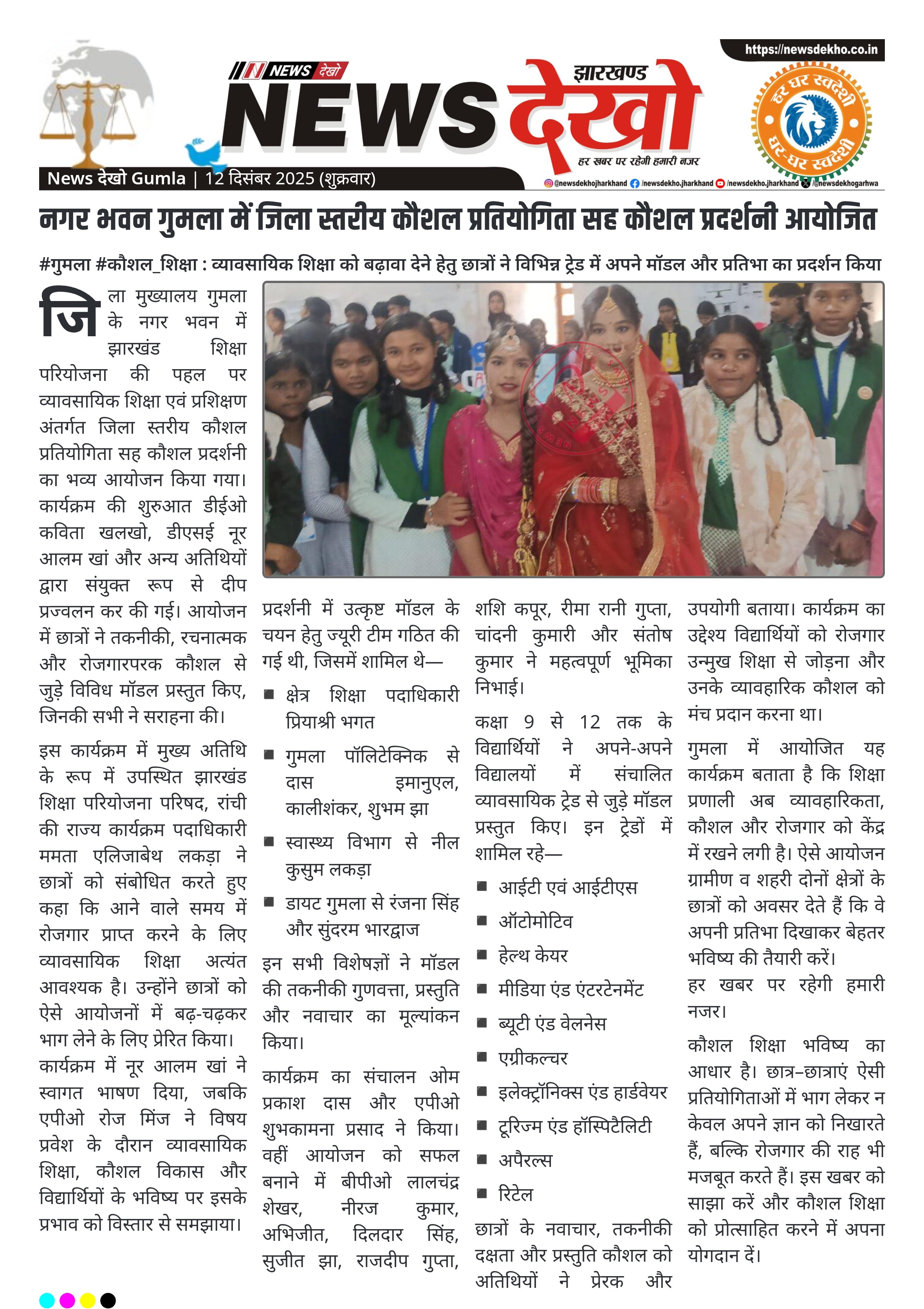 #गुमला #कौशल_शिक्षा : व्यावसायिक शिक्षा को बढ़ावा देने हेतु छात्रों ने विभिन्न ट्रेड में अपने मॉडल और प्रतिभा का प्रदर्शन किया नगर भवन गुमला में जिला स्तरीय कौशल प्रतियोगिता आयोजित। दीप प्रज्वलन कर डीईओ कविता खलखो, डीएसई नूर आलम खां ने कार्यक्रम की शुरुआत की। मुख्य अतिथि ममता एलिजाबेथ लकड़ा…