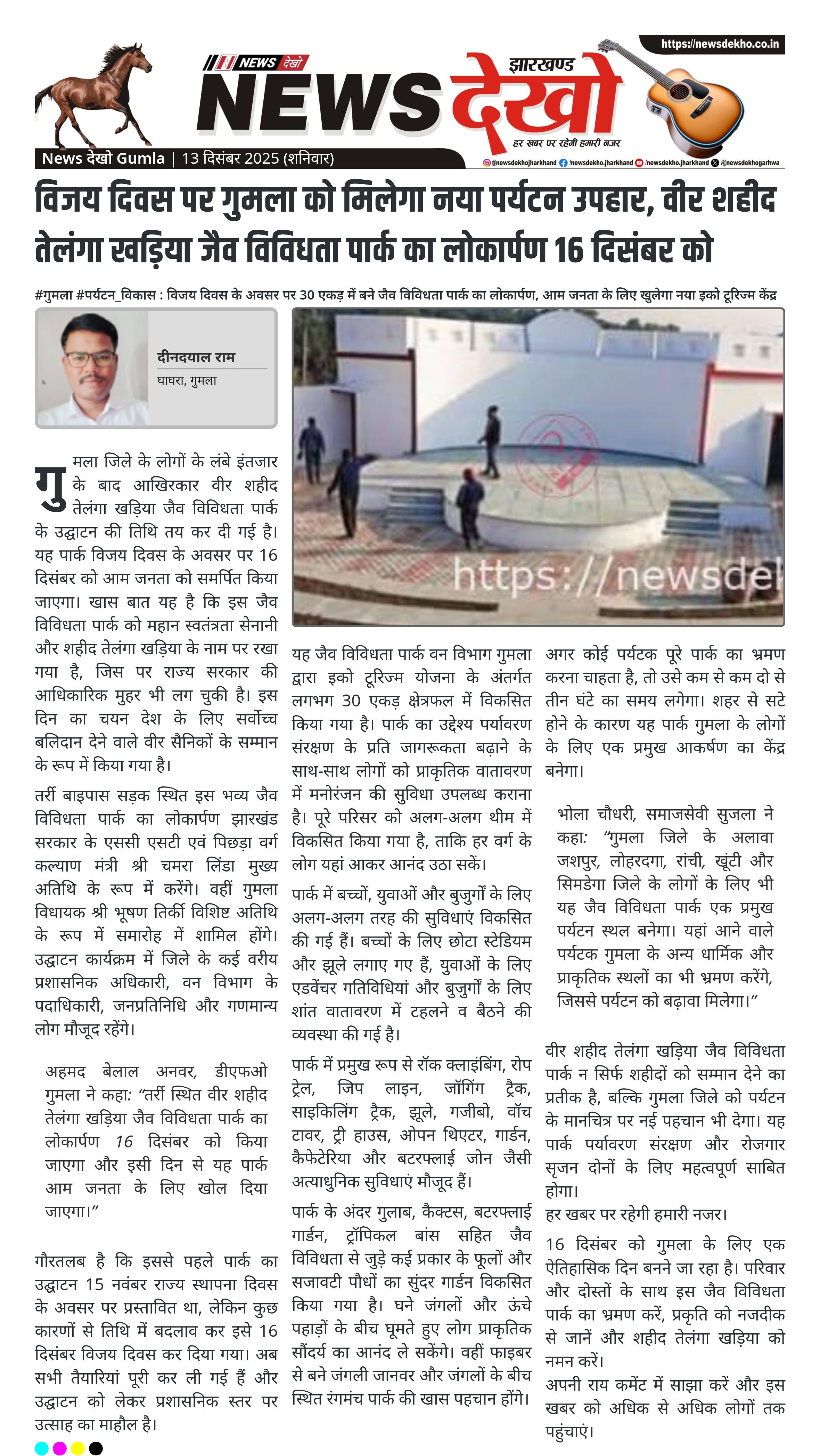 विजय दिवस पर गुमला को मिलेगा नया पर्यटन उपहार, वीर शहीद तेलंगा खड़िया जैव विविधता पार्क का लोकार्पण 16 दिसंबर को