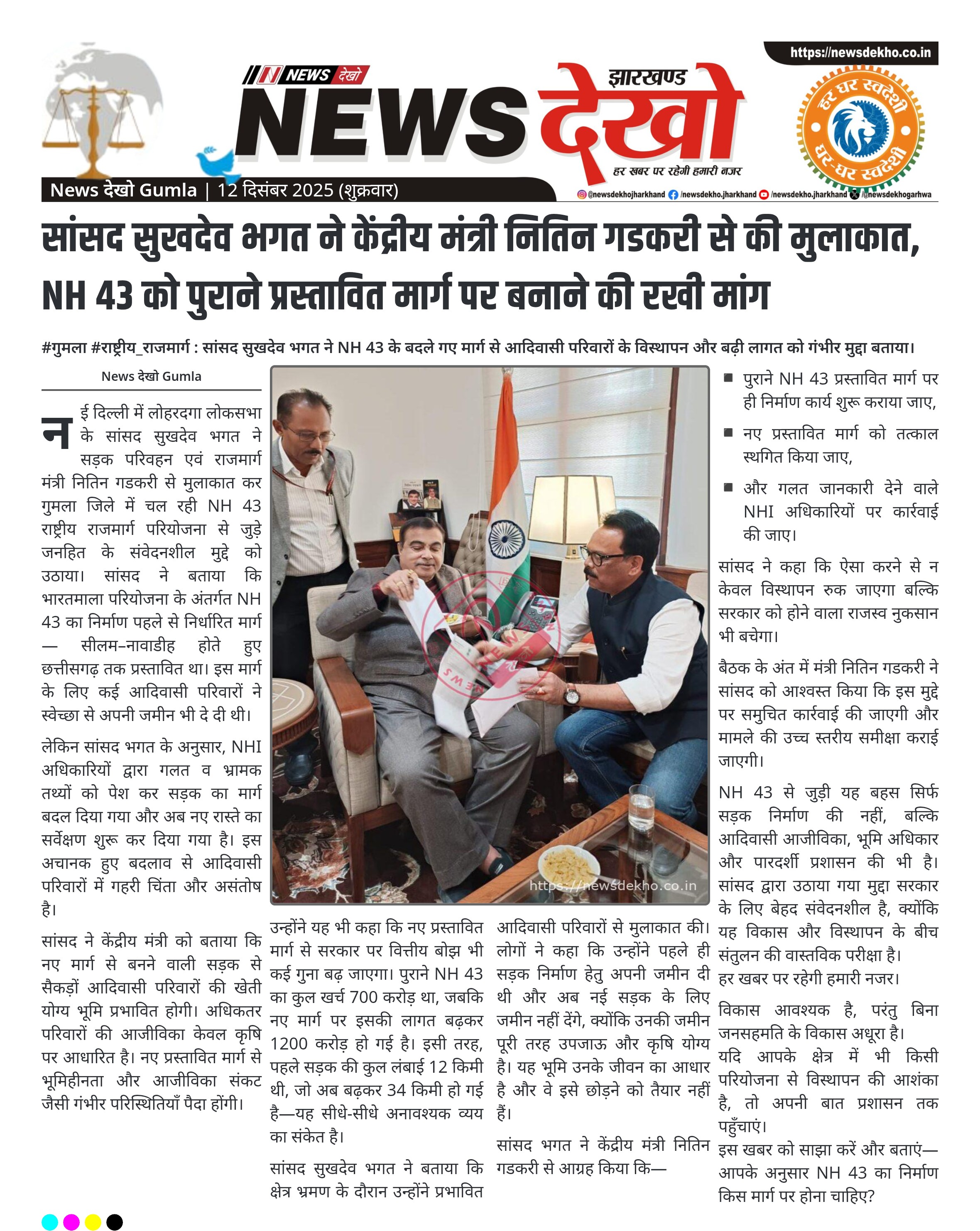 सांसद सुखदेव भगत ने केंद्रीय मंत्री नितिन गडकरी से की मुलाकात, NH 43 को पुराने प्रस्तावित मार्ग पर बनाने की रखी मांग