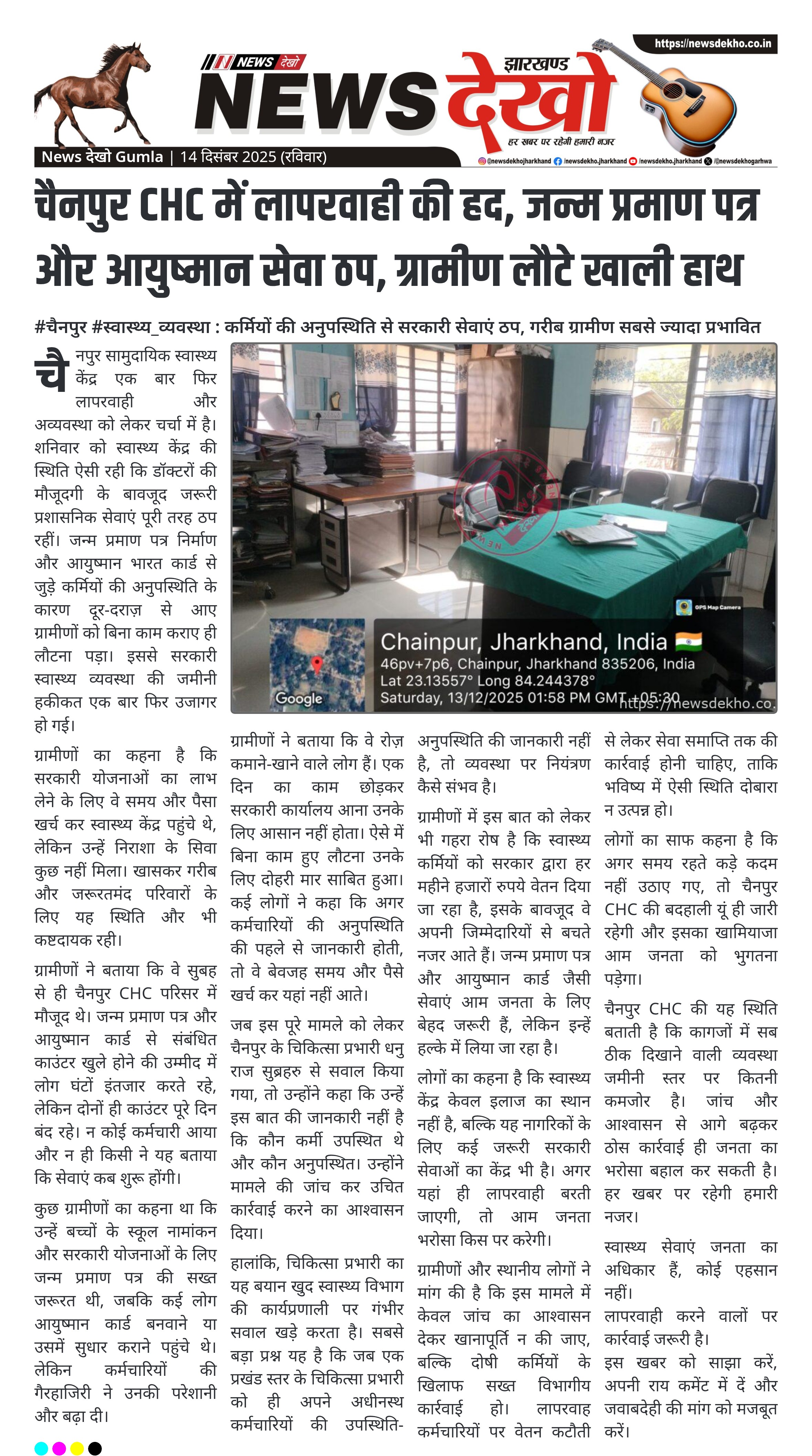 #चैनपुर #स्वास्थ्य_व्यवस्था : कर्मियों की अनुपस्थिति से सरकारी सेवाएं ठप, गरीब ग्रामीण सबसे ज्यादा प्रभावित चैनपुर CHC में जरूरी सेवाएं बंद। जन्म प्रमाण पत्र काउंटर रहा बंद। आयुष्मान भारत कार्ड से जुड़े कर्मी नदारद। दूरदराज़ से आए ग्रामीण परेशान। चिकित्सा प्रभारी को कर्मियों की जानकारी नहीं। चैनपुर सामुदायिक स्वास्थ्य केंद्र…