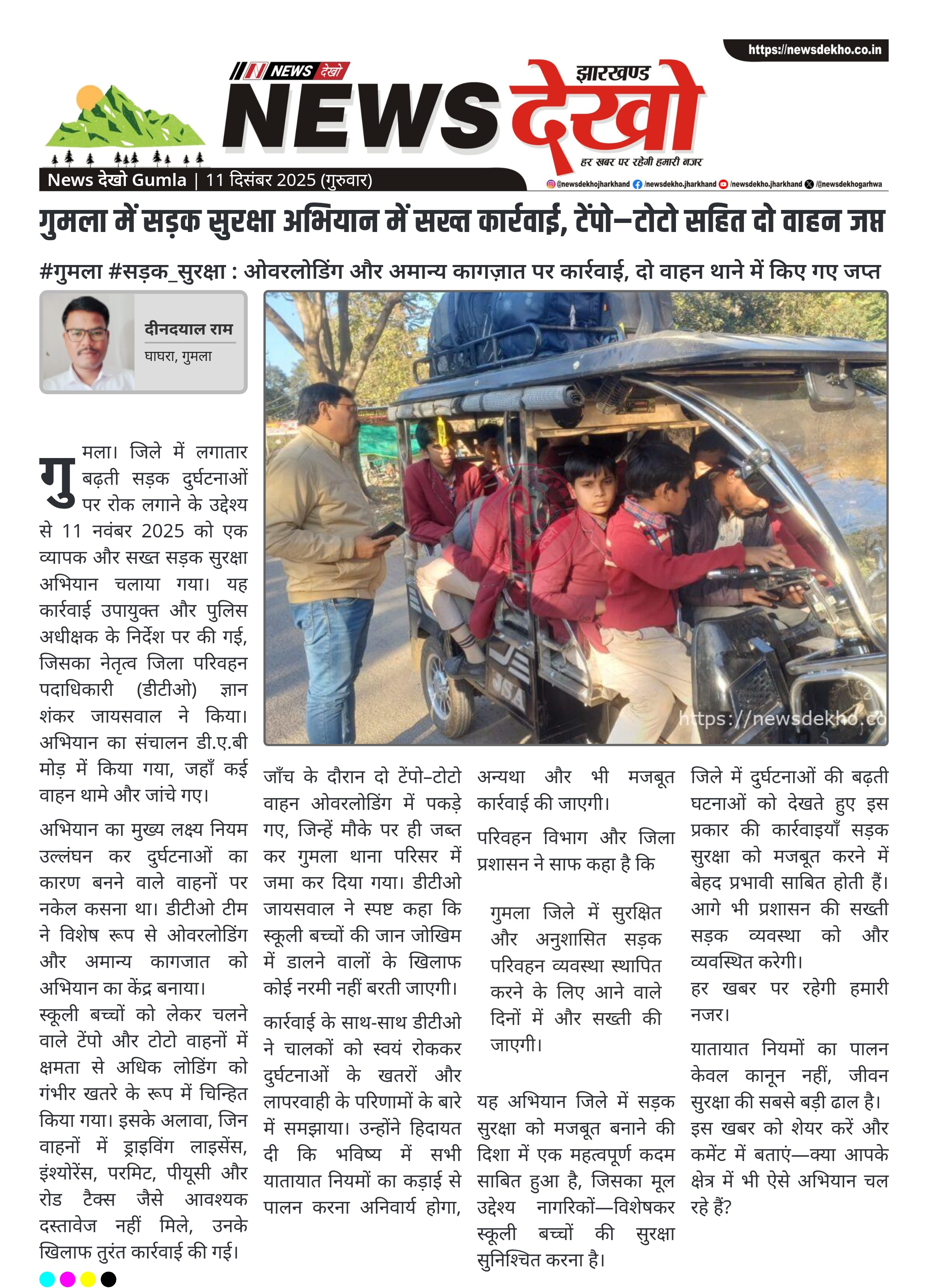 #गुमला #सड़क_सुरक्षा : ओवरलोडिंग और अमान्य कागज़ात पर कार्रवाई, दो वाहन थाने में किए गए जप्त 11 नवंबर 2025 को गुमला में सघन सड़क सुरक्षा अभियान चलाया गया। अभियान का नेतृत्व डीटीओ ज्ञान शंकर जायसवाल ने डी.ए.बी मोड़ में किया। ओवरलोडिंग और अमान्य कागज़ात की जांच मुख्य फोकस रहा। ओवरलोड…