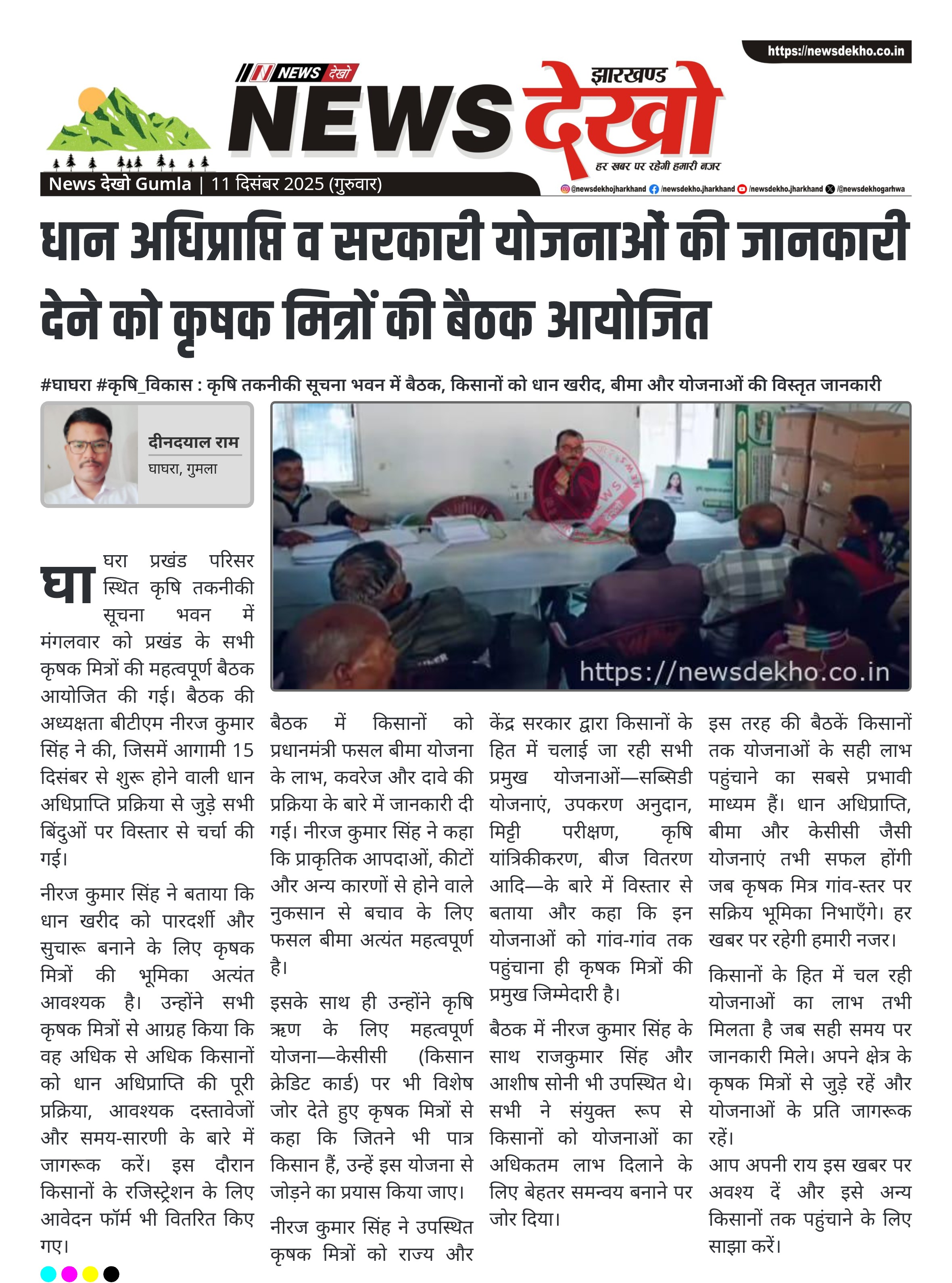 #घाघरा #कृषि_विकास : कृषि तकनीकी सूचना भवन में बैठक, किसानों को धान खरीद, बीमा और योजनाओं की विस्तृत जानकारी कृषि तकनीकी सूचना भवन में कृषक मित्रों की बैठक संपन्न। 15 दिसंबर से शुरू होने वाली धान अधिप्राप्ति प्रक्रिया पर चर्चा। बीटीएम नीरज कुमार सिंह ने रजिस्ट्रेशन फॉर्म वितरित किए। फसल…