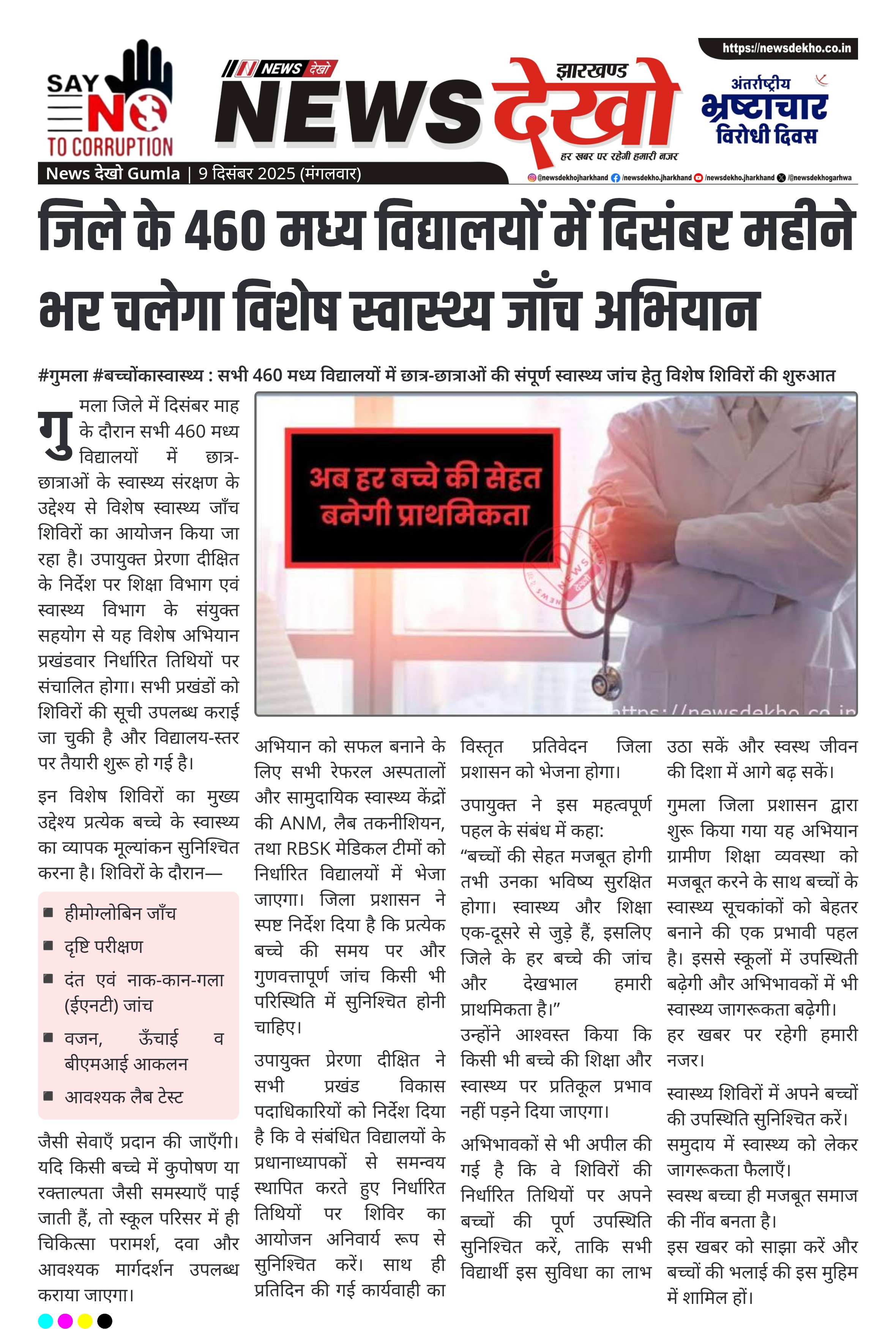 #गुमला #बच्चोंकास्वास्थ्य : सभी 460 मध्य विद्यालयों में छात्र-छात्राओं की संपूर्ण स्वास्थ्य जांच हेतु विशेष शिविरों की शुरुआत 460 मध्य विद्यालयों में पूरे दिसंबर माह स्वास्थ्य जाँच शिविर आयोजित होंगे। निर्देश उपायुक्त प्रेरणा दीक्षित द्वारा जारी, शिक्षा व स्वास्थ्य विभाग का संयुक्त संचालन। हीमोग्लोबिन, दृष्टि, दंत, ईएनटी, वजन-ऊँचाई, बीएमआई सहित…