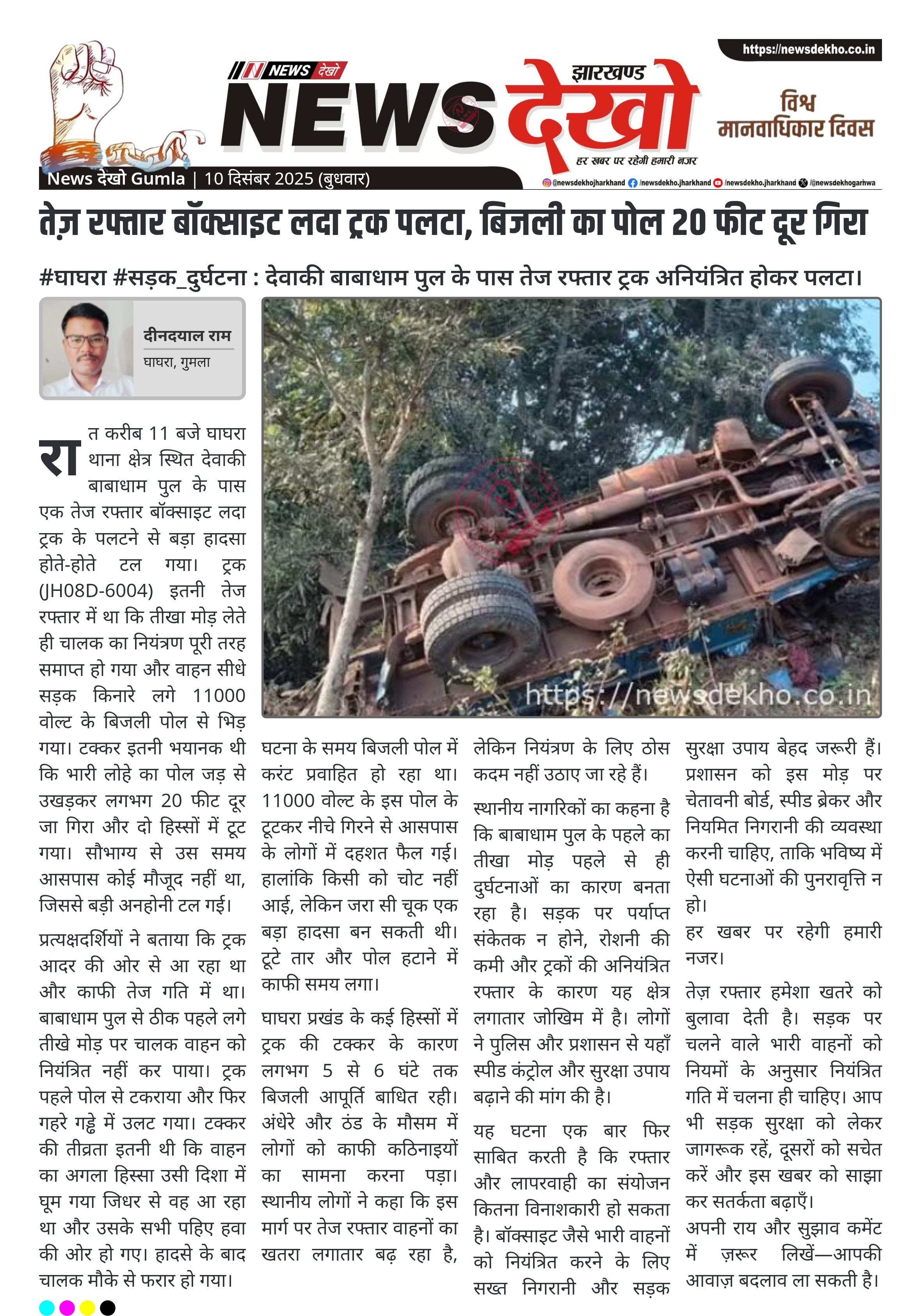 #घाघरा #सड़क_दुर्घटना : देवाकी बाबाधाम पुल के पास तेज रफ्तार ट्रक अनियंत्रित होकर पलटा। बॉक्साइट लदा ट्रक (JH08D-6004) सोमवार रात देवाकी बाबाधाम पुल के पास पलटा। ट्रक की जोरदार टक्कर से 11000 वोल्ट का भारी बिजली पोल जड़ से उखड़कर 20 फीट दूर गिरा। ट्रक चालक मौके से फरार, किसी…